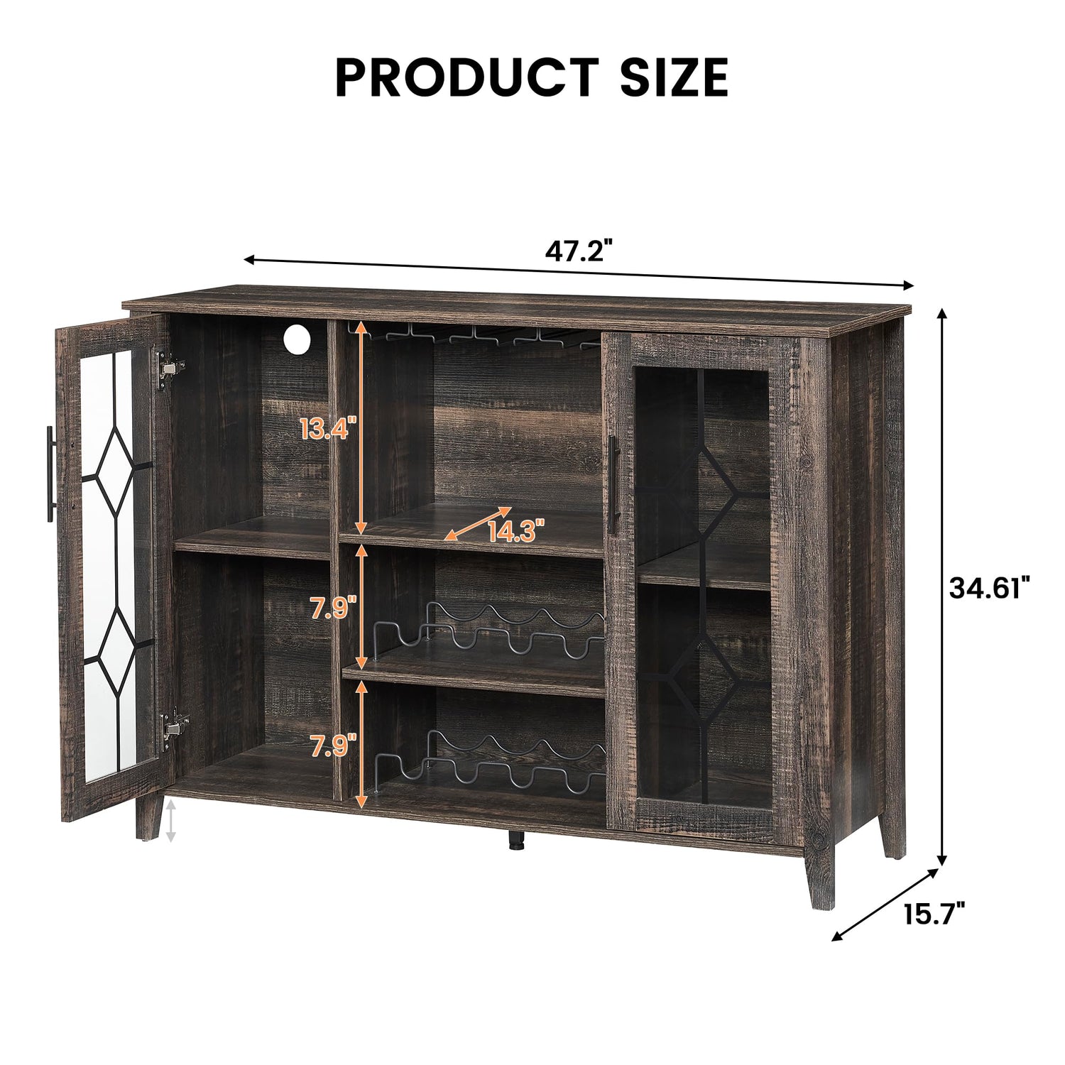 - 【Large & Flexible Storage】This bar cabinet features integrated wine racks, glass holders, and storage cabinets. It includes open storage spaces and two storage cabinets with glass doors, providing ample space for larger items or additional bottles. The spacious tabletop allows for the easy display and access of bottles and accessories. Additionally, the wine rack and glass holders enable you to neatly showcase and organize your wine and glasses, ensuring everything is well-arranged.