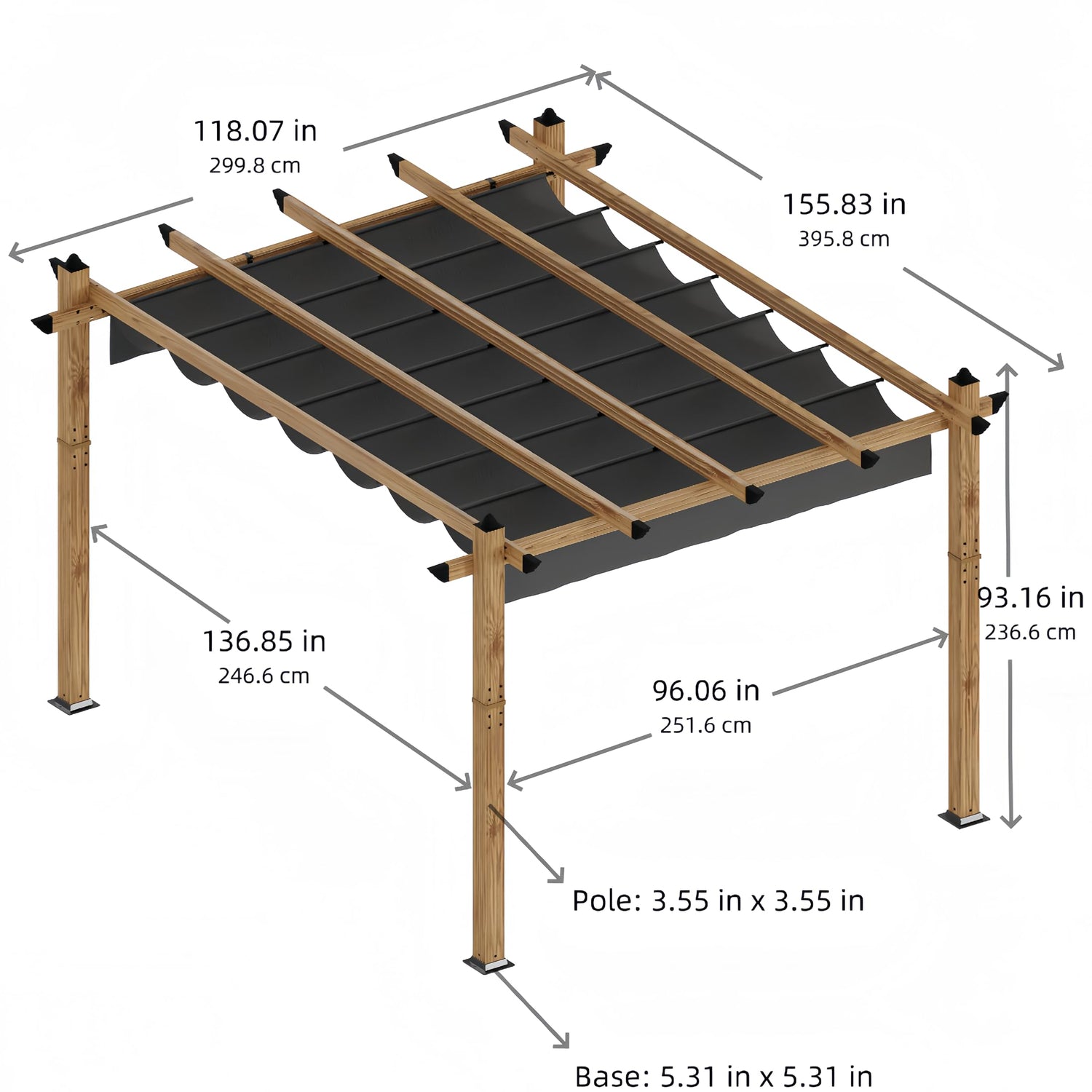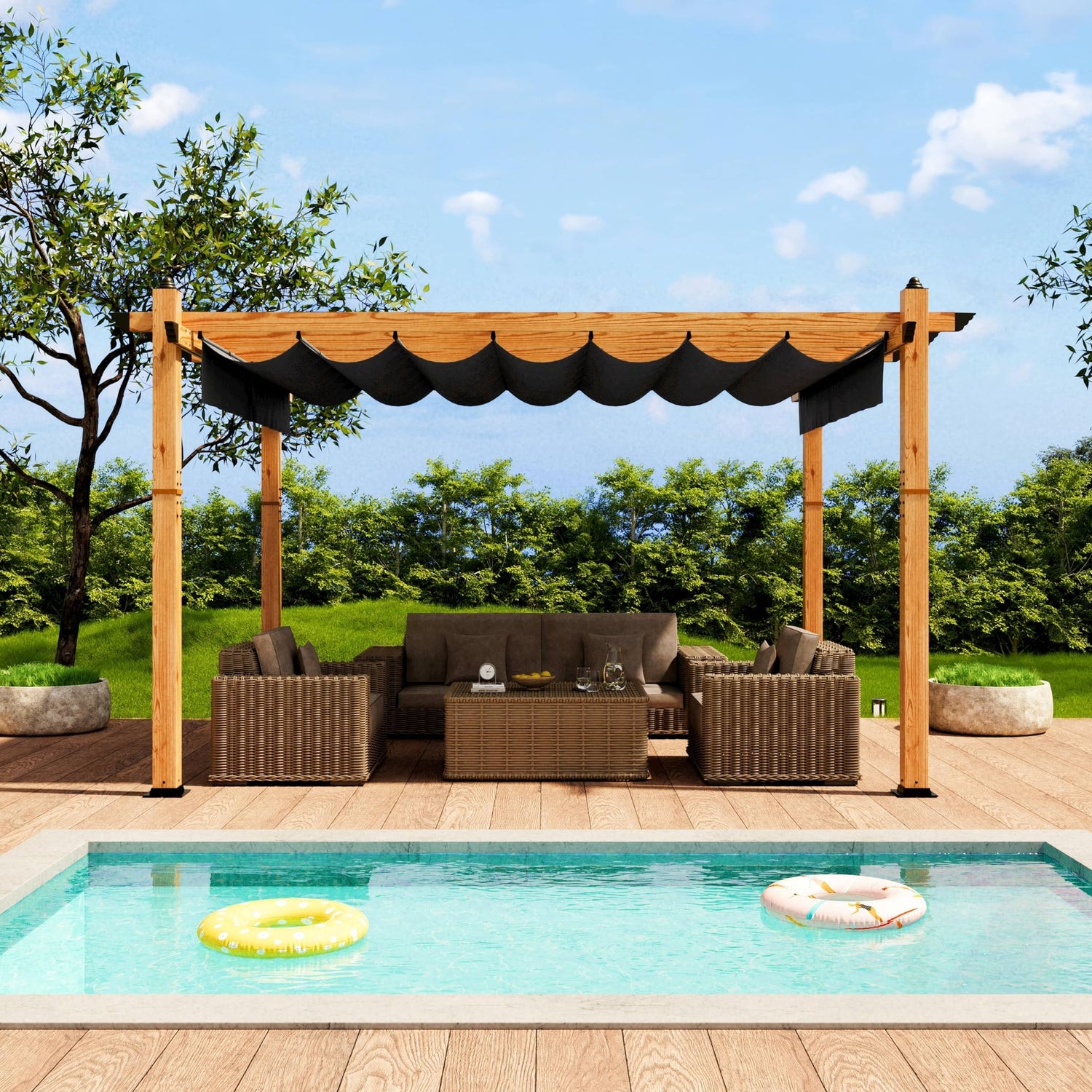 Details: GarveeLife 10 x 13 Ft Wood-Grain Aluminum Pergola Outdoor Pergola with Retractable Canopy Sun Shade Shelter for Garden, Patio, Backyard, Deck - Gray