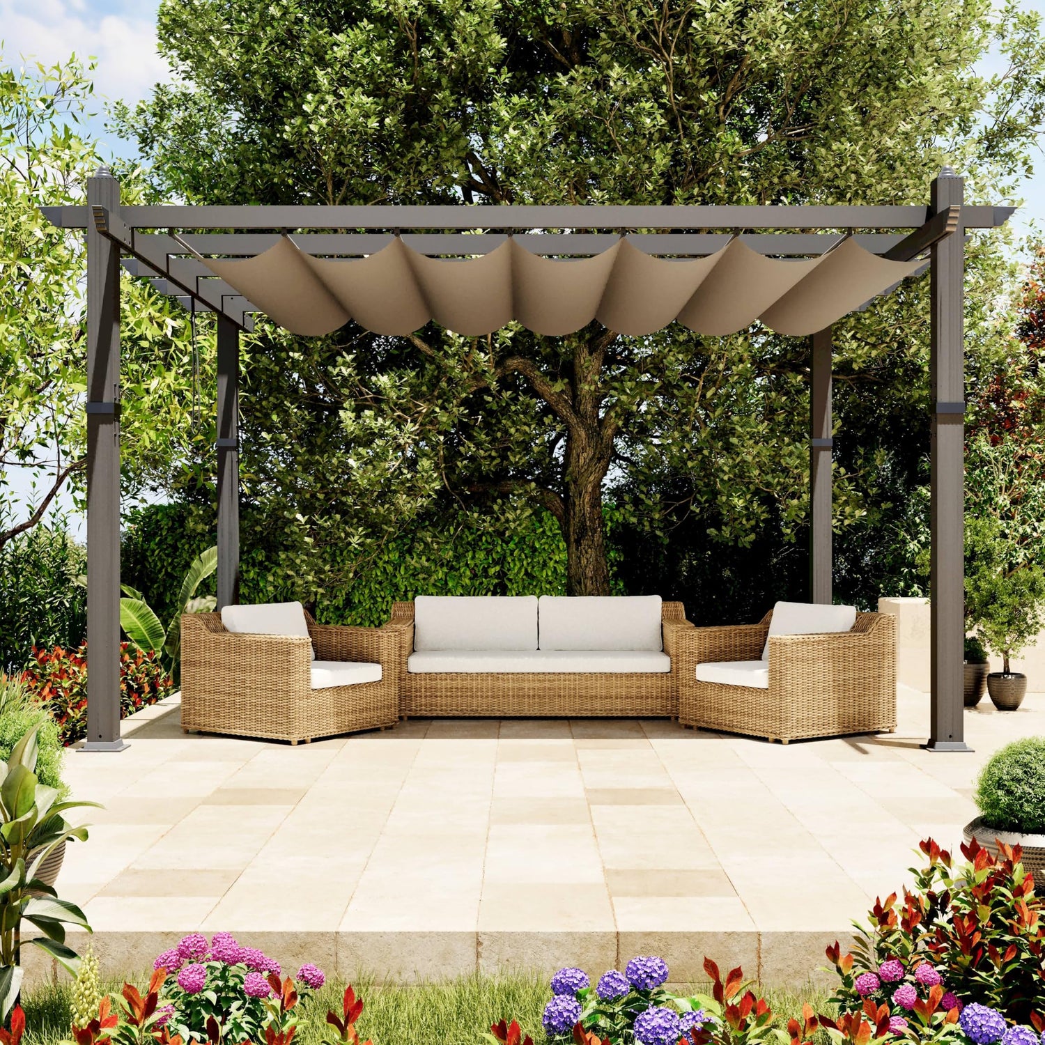 GarveeLife 10x13 Ft Aluminum Pergola, Outdoor Metal Pergola with Adjustable Canopy, Reinforced Frame Outdoor Shelter for Backyard, Garden and Deck - Khaki