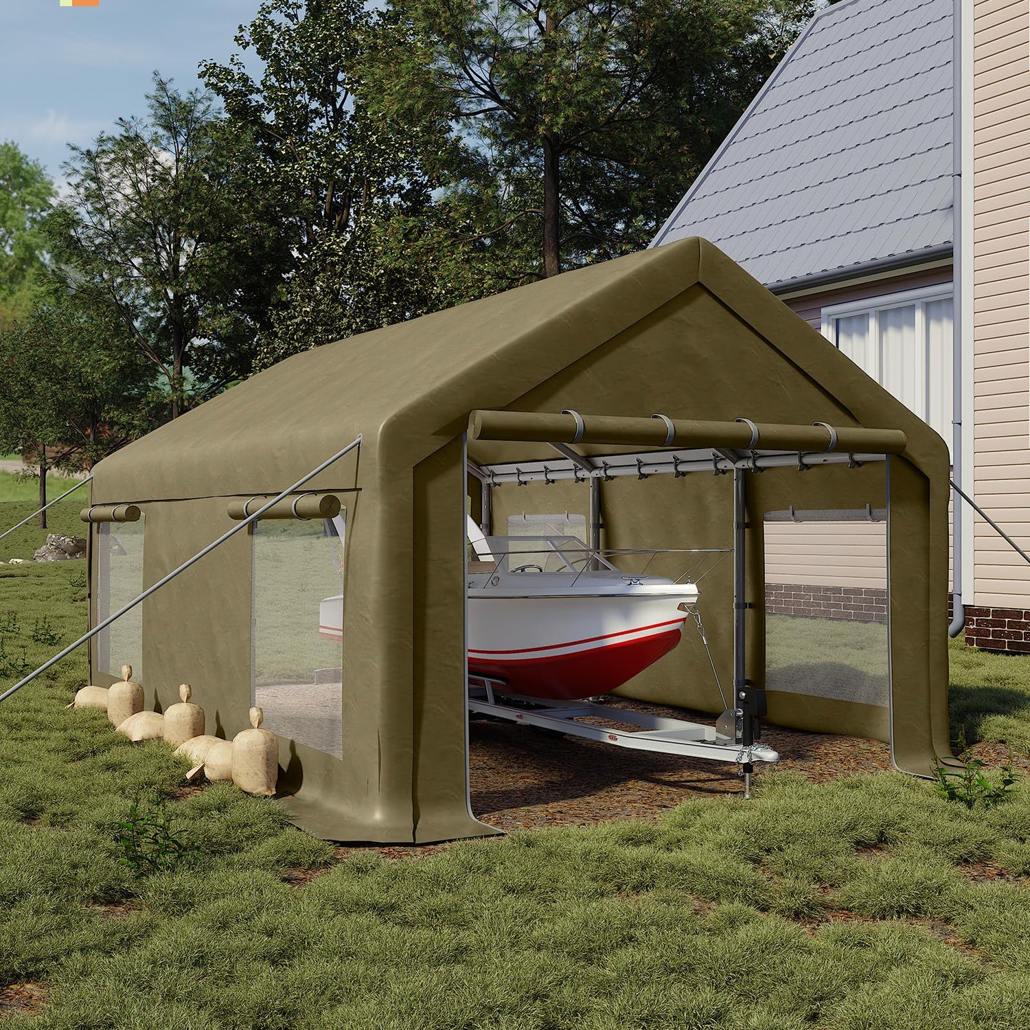 GarveeLife 10x20 Ft Carport, Car Port with 200g PE Tarp, Roll-Up Doors, and 4 Windows, for Sedans, Bass Boats, Motos, ATVs, and SUVs, Khaki