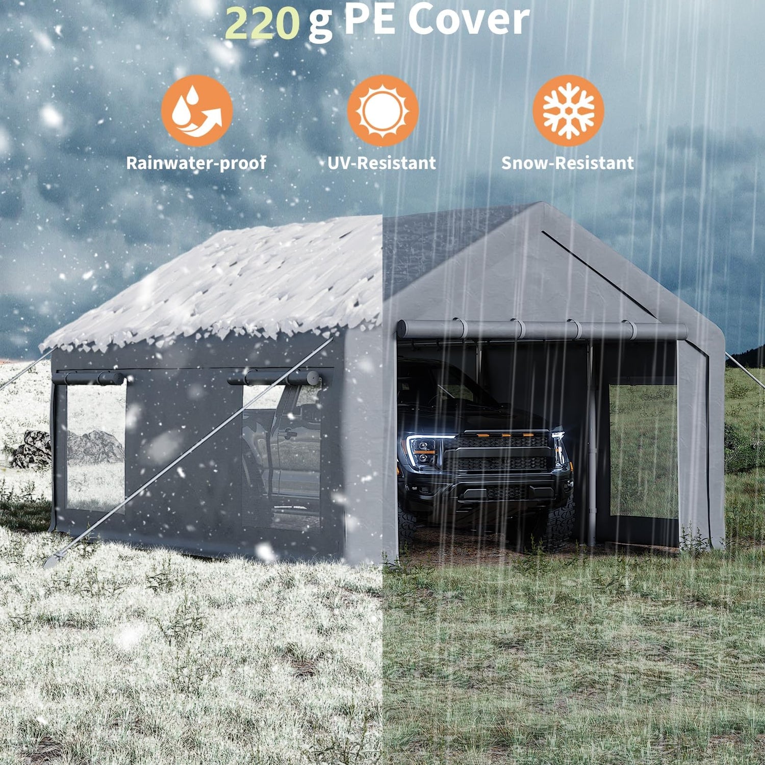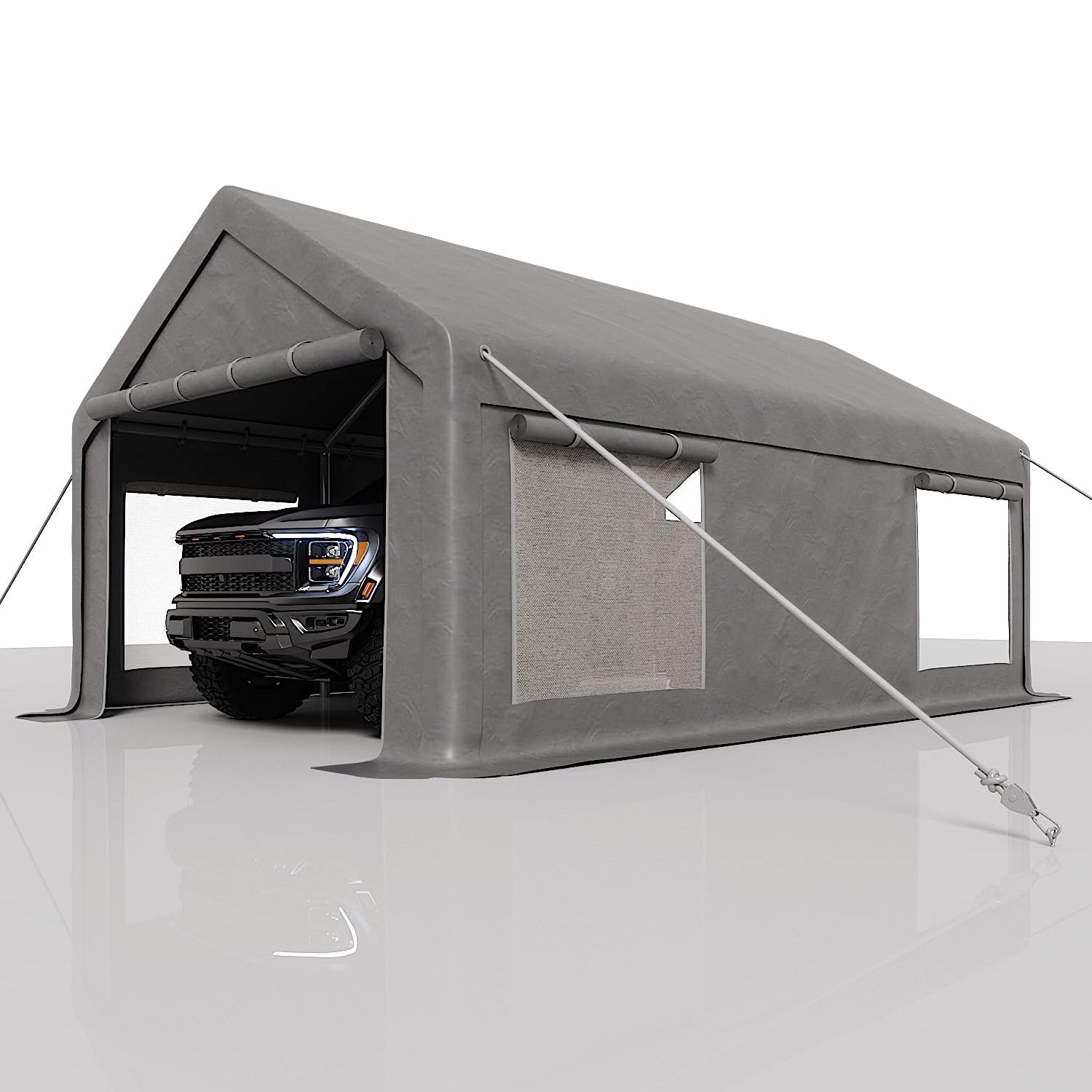 GarveeLife 13x20 Ft Carport with 8 Sandbags, Car Port with 220g PE Tarp, 2 Roll-Up Doors, and 4 Windows, for Full-Size Pickups, Bass Boats, Tractors, and SUVs, Gray