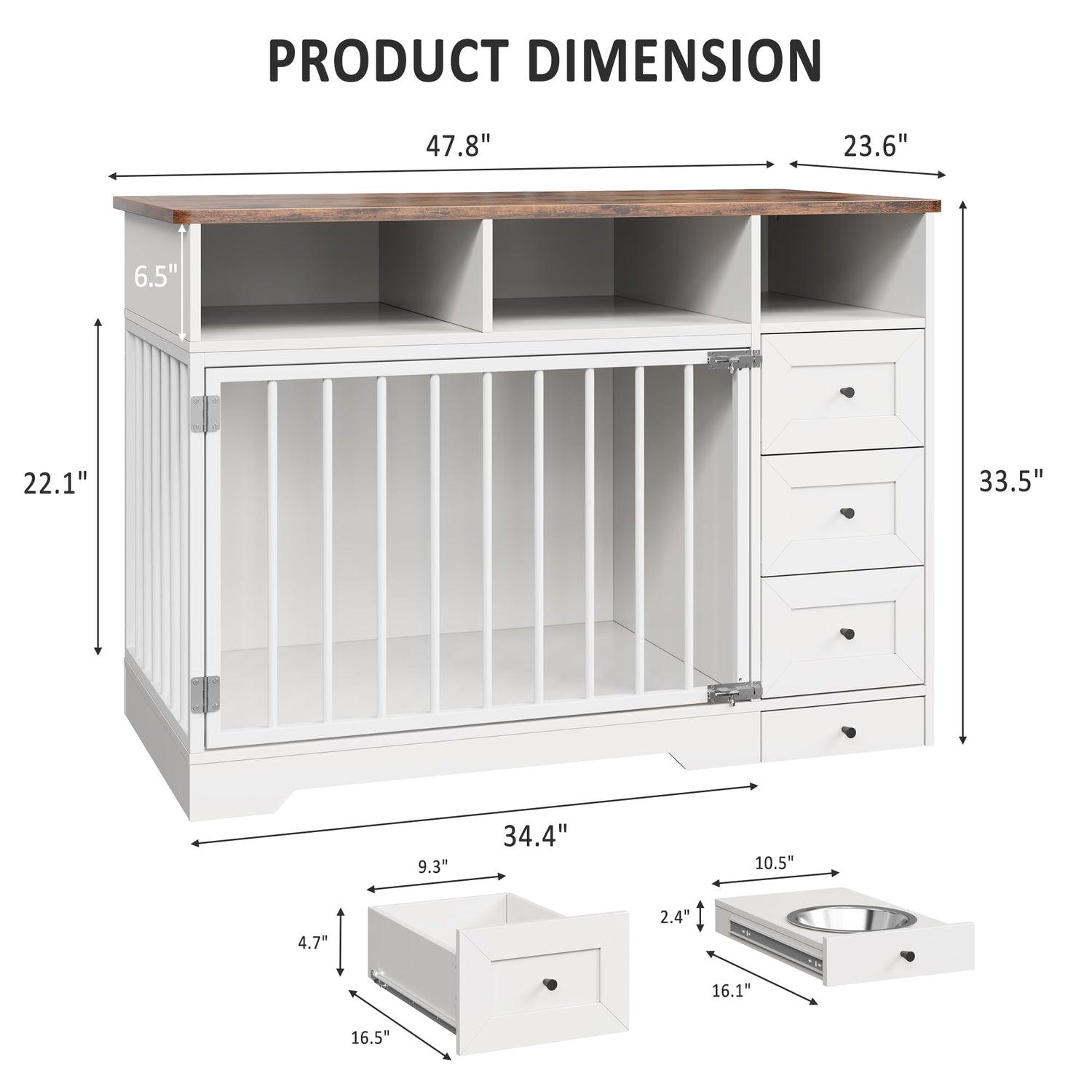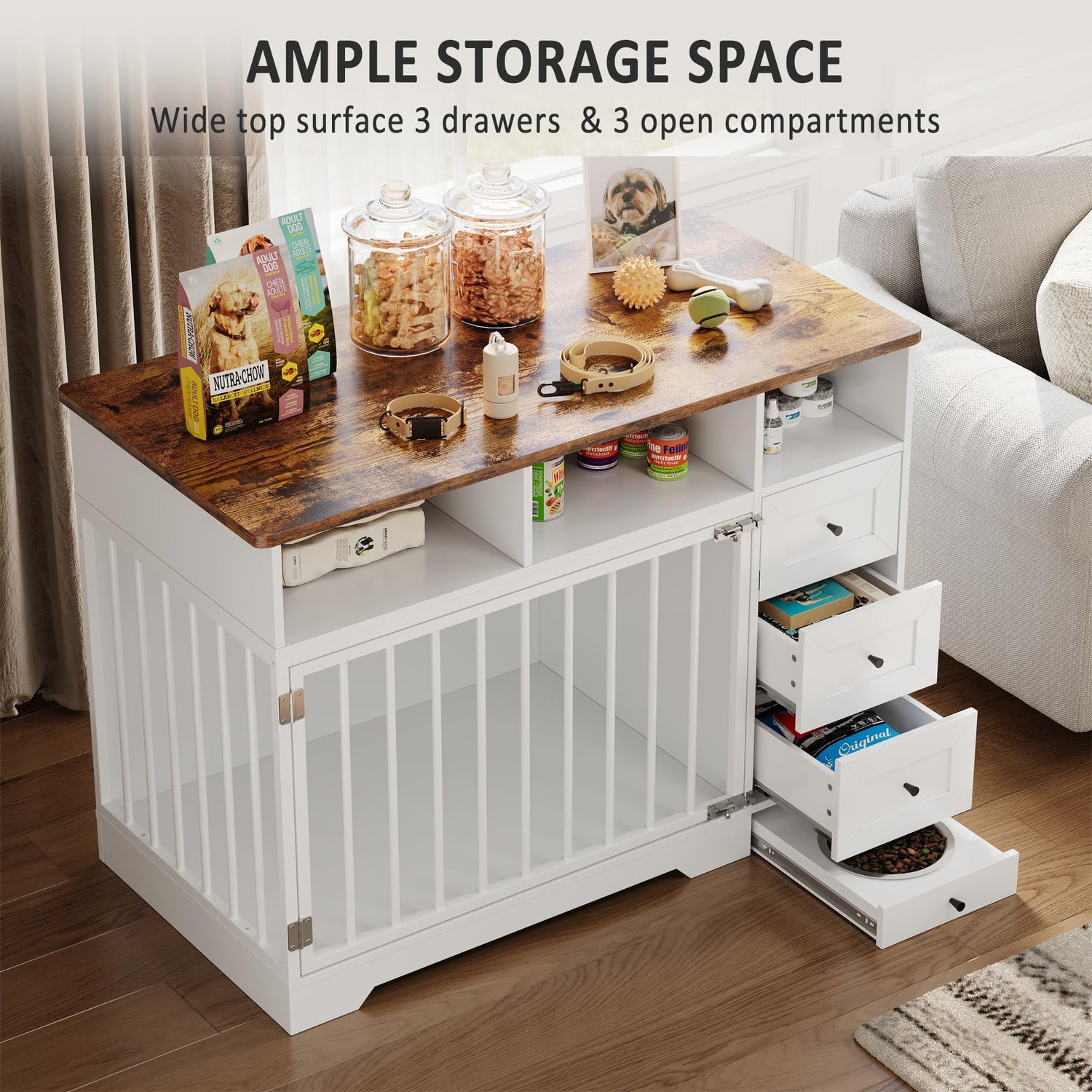 - 【Organized Living】This modern dog crate features a generous tabletop for displaying decor or essentials, plus three open drawers and three concealed drawers. Keep your pet's toys, leashes, and accessories organized while maintaining a tidy living area.