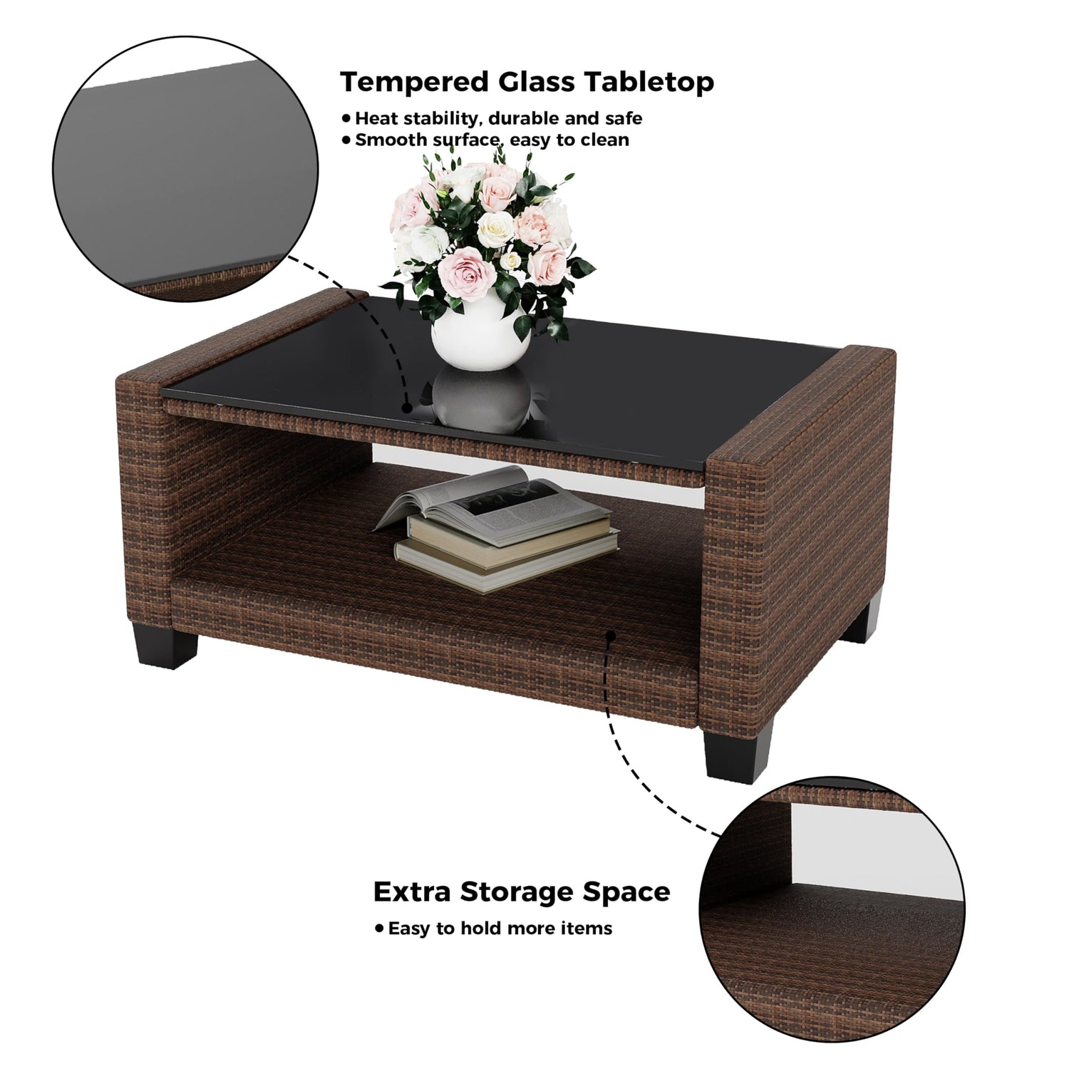 - 5 Pieces Set: The 7-seater patio furniture set includes 2 armchairs, a loveseat, a couch, and a storage coffee table, diverse and unique styles. The tempered glass coffee table with storage allows storing books, magazines etc. for easy access anytime, and tempered glass tabletop is easy to clean.