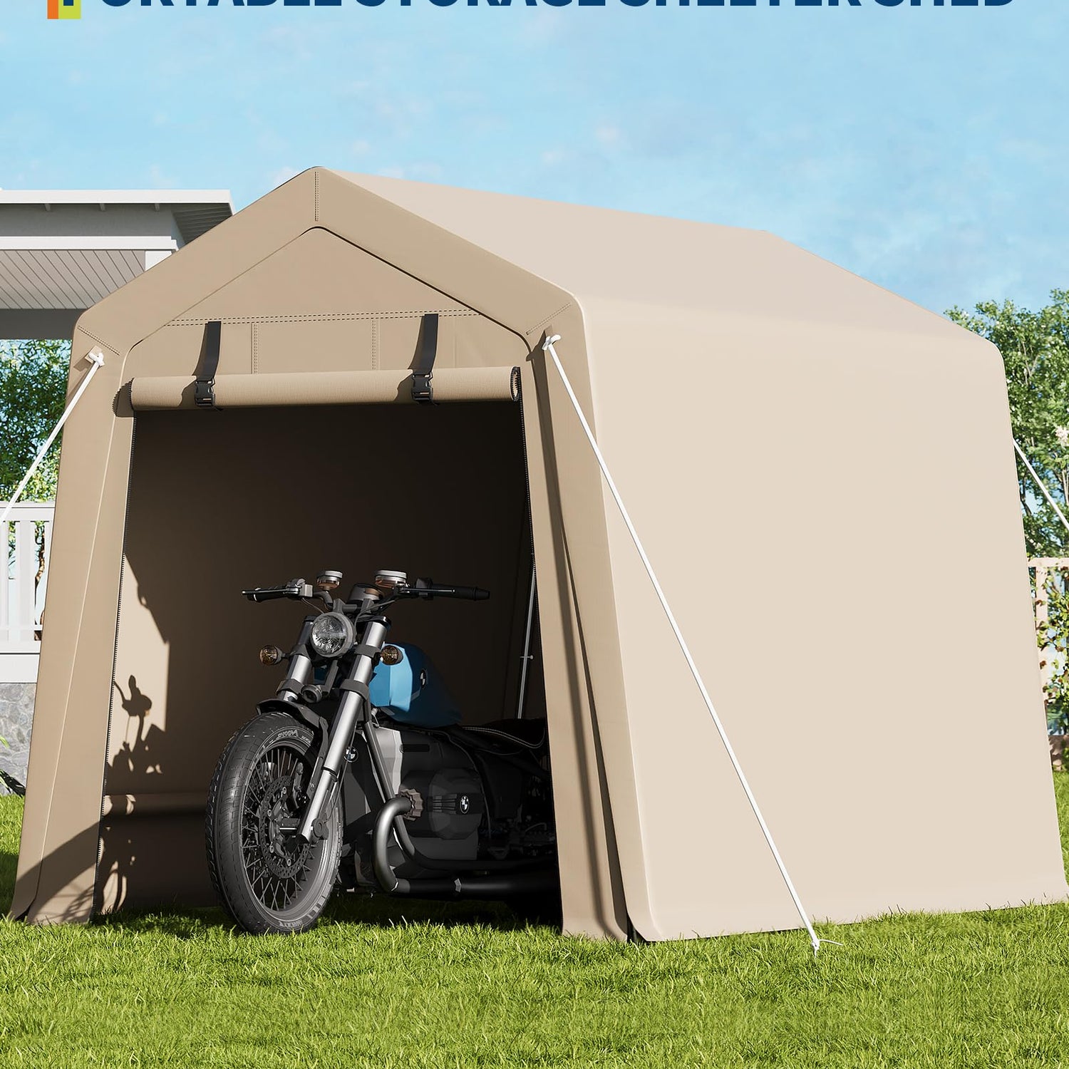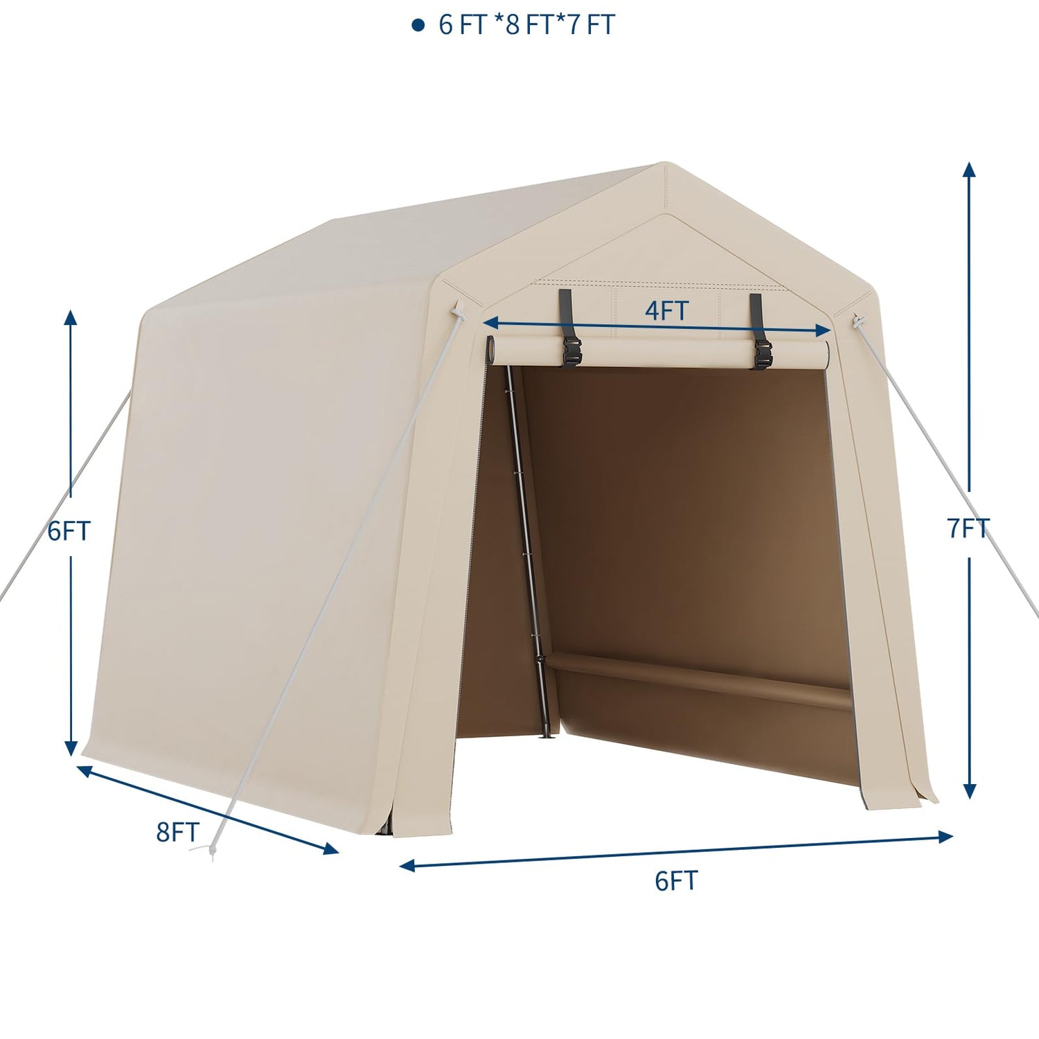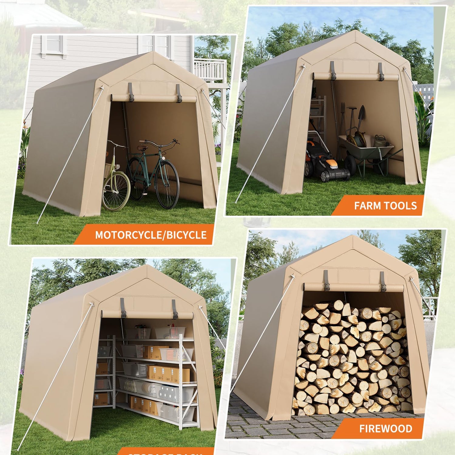 GarveeLife 6x8 FT Portable Outdoor Storage Shed with 2 Roll-Up Zipper Doors & Vents, 240G Heavy-Duty Shelter Waterproof PE Tarp, UV-Resistant Carport for Motorcycle, Firewood, Tools -Khaki