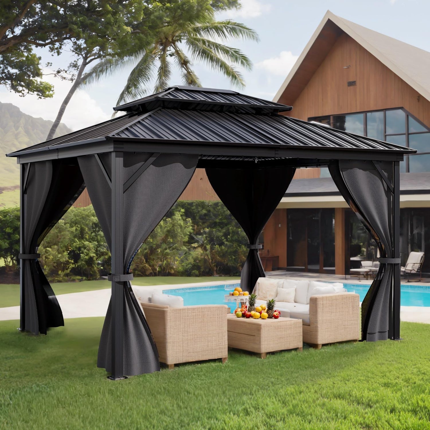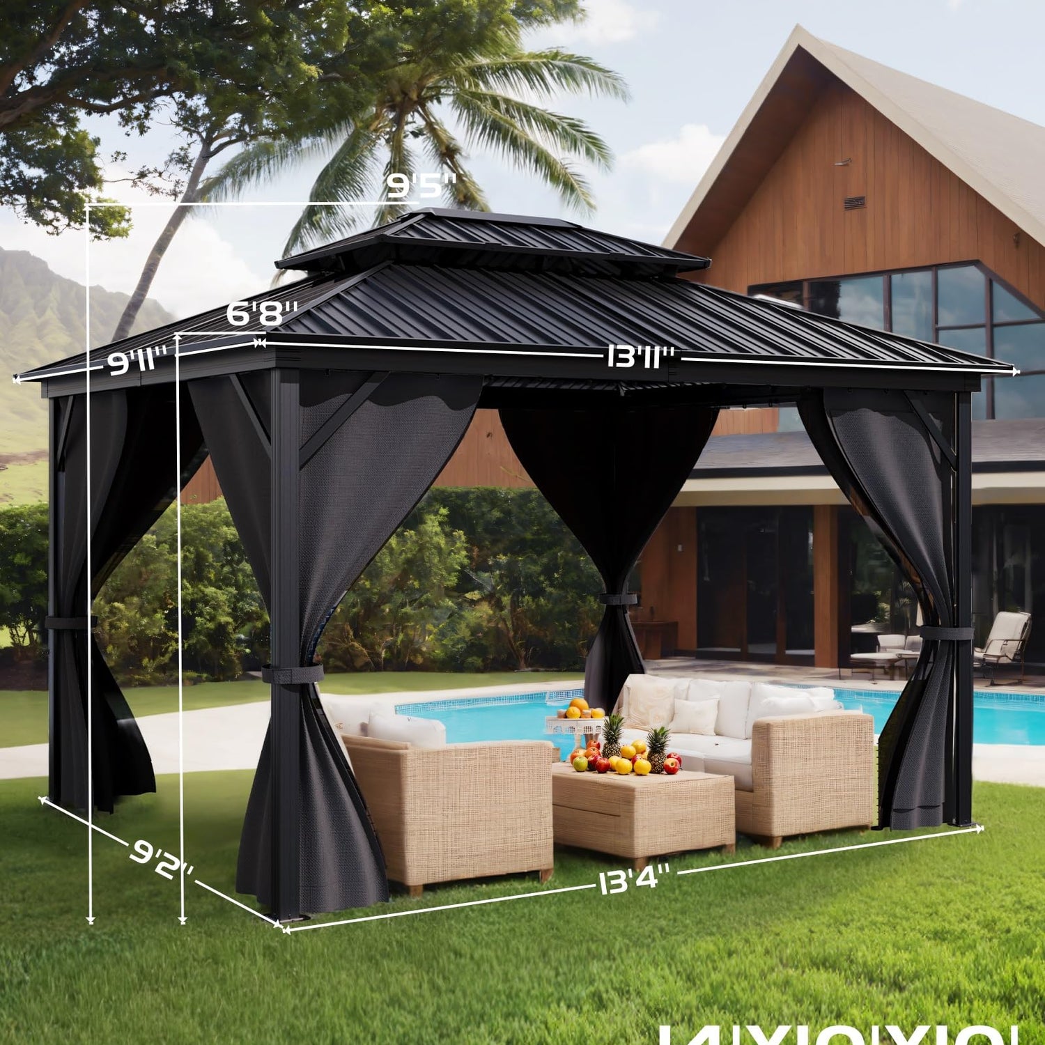 Details: GarveeLife Hardtop Gazebo 10'x14' for All Weather, with Double Metal Roof, Aluminum Alloy Frame, Net, and Curtain, Permanent Building for Patio, Deck, Backyard, Lawn, and Garden, Gray