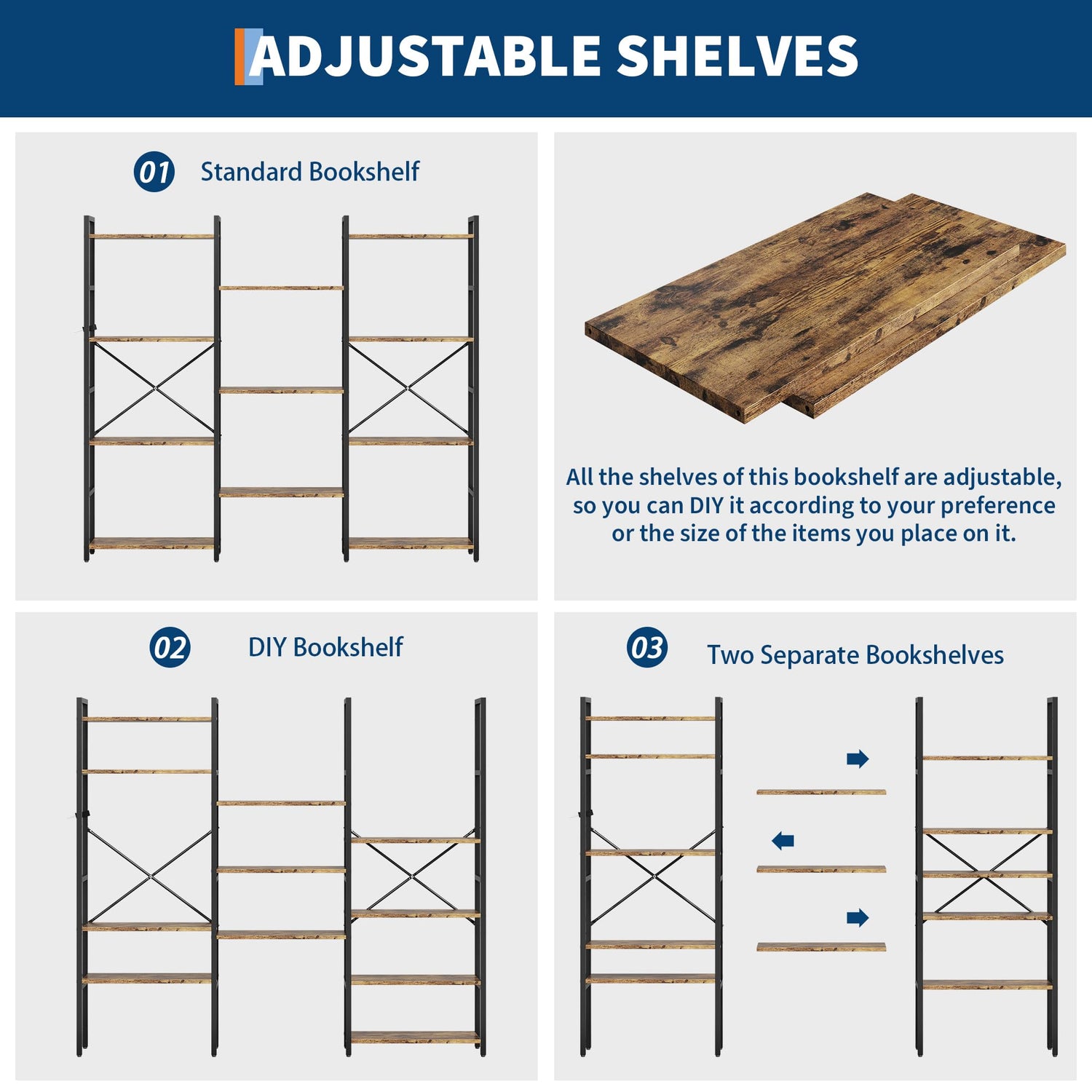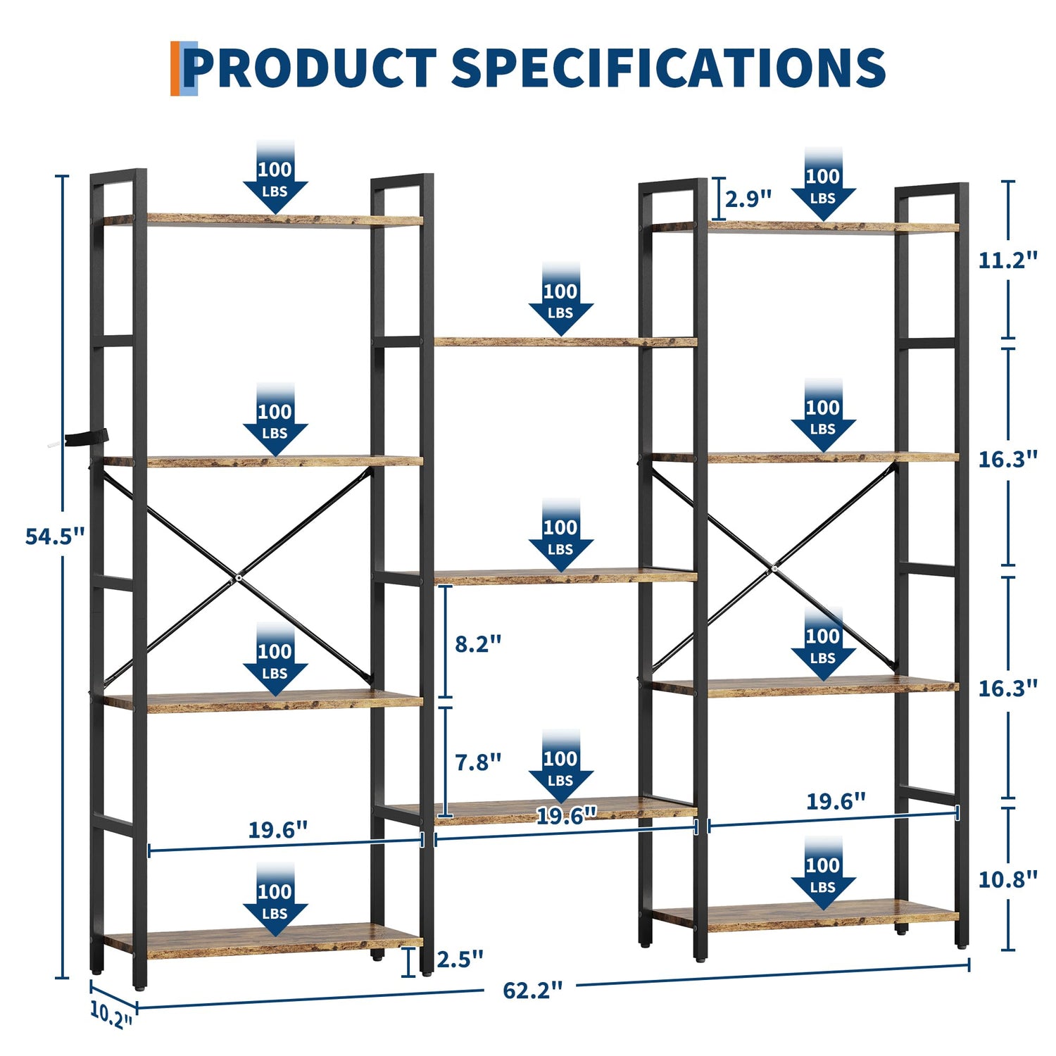 - Heavy-Duty & Durable:Built with high-quality metal frame + thick particle board, this industrial bookshelf supports up to 100 LBS per shelf. Features anti-rust coating and reinforced X-shaped crossbars for extra stability, making it a long-lasting storage solution.