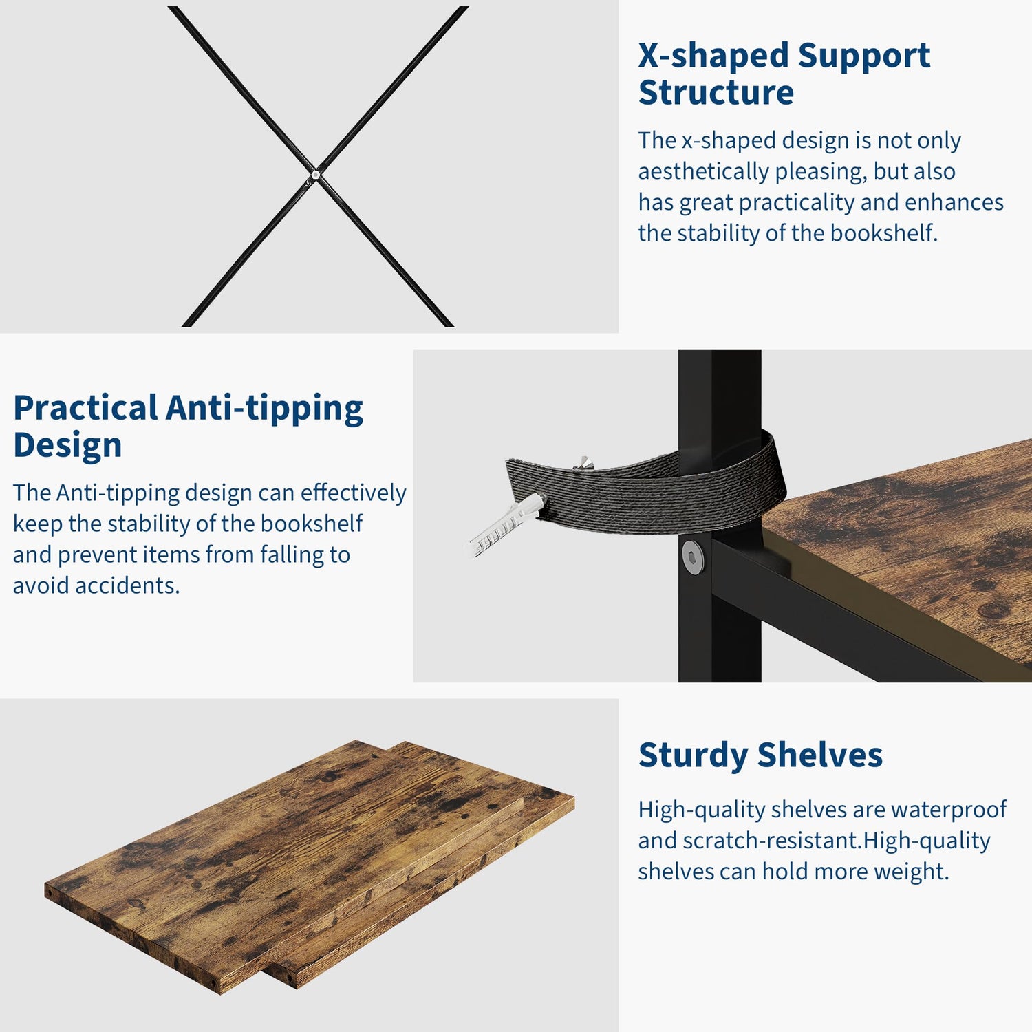 - Heavy-Duty & Durable:Built with high-quality metal frame + thick particle board, this industrial bookshelf supports up to 100 LBS per shelf. Features anti-rust coating and reinforced X-shaped crossbars for extra stability, making it a long-lasting storage solution.