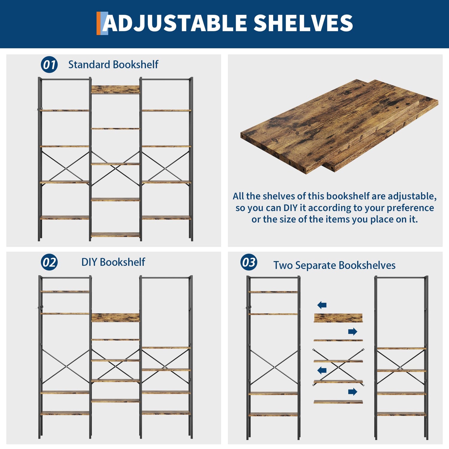 - Spacious Triple 5 Tier Book Shelf with 14 Open Shelves:This large multifunctional bookshelf offers 14 open storage shelves, perfect for displaying books, CDs, photo frames, potted plants, collectibles, and decor. The tiered design ensures stylish organization while maximizing space in living rooms, offices, bedrooms, or studios.