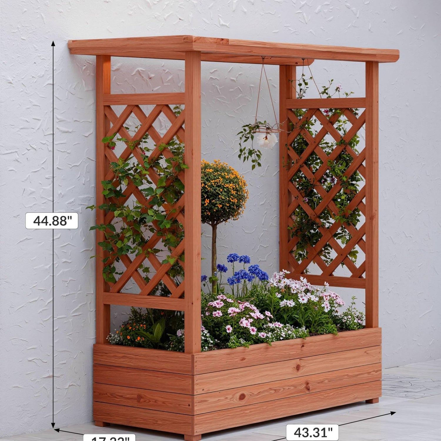 GarveeLife Raised Garden Bed with Trellis, 45 Inch Wood Planter Box with Side Trellis, Hanging Roof, and 4 Drainage Holes, Freestanding Elevated Garden Bed for Climbing Plants, Vines, Flowers