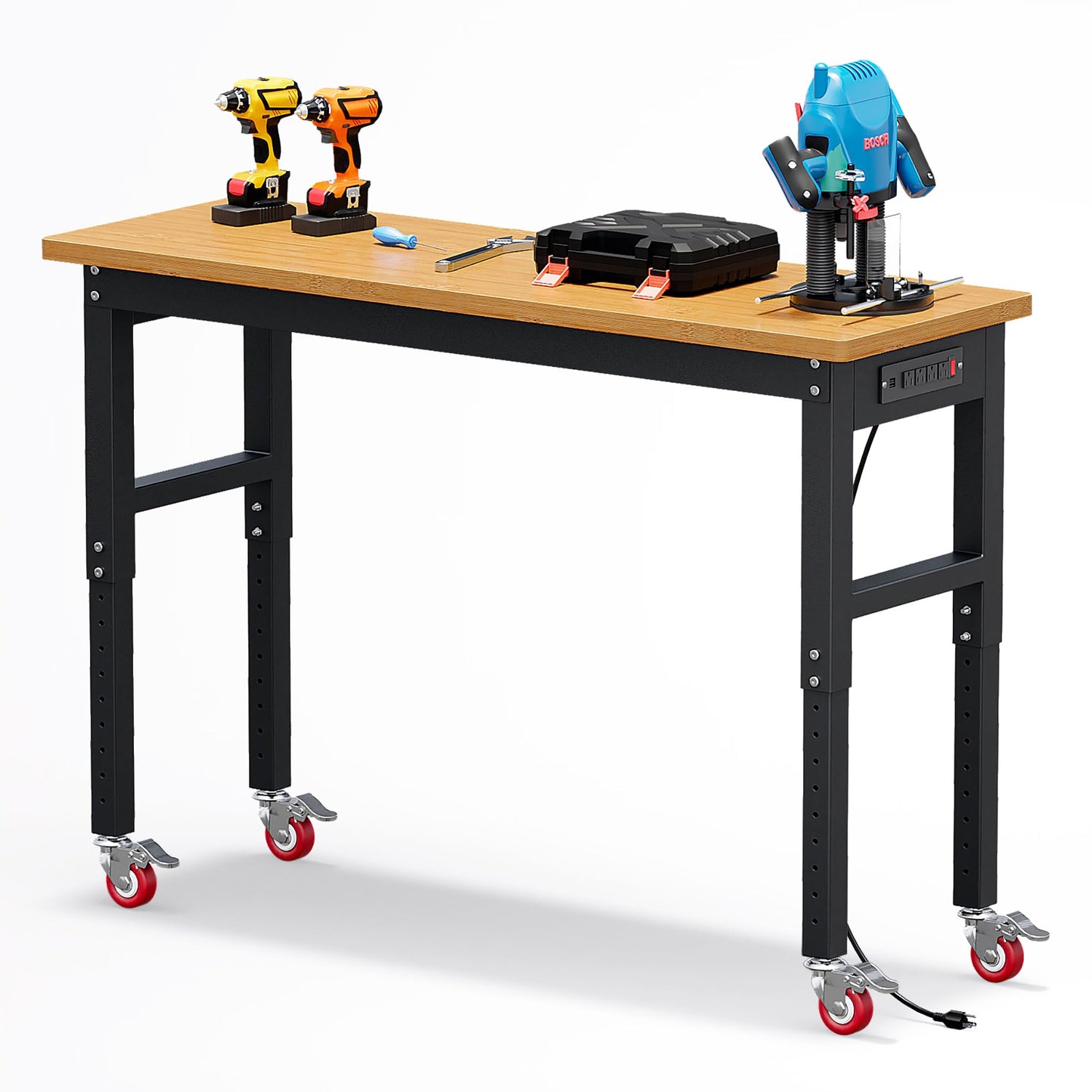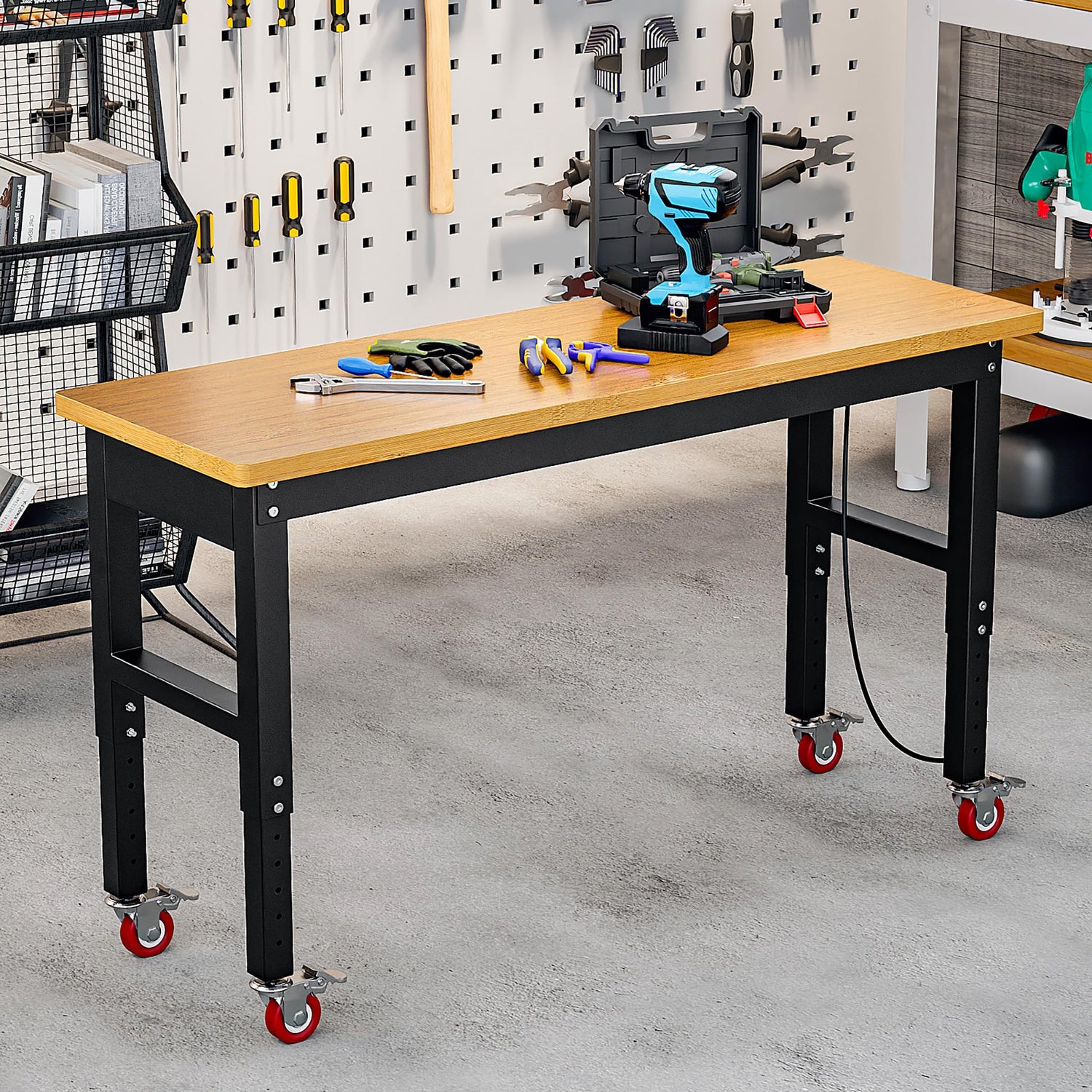 Details: GarveeTech 60 Inch Work Bench with Wheels, 2200 LBS Capacity Rubber Wood Top Worktable with Stable Steel Frame, 10 Level Adjust Height Work Station with Power Outlets, for Garage, Shop, Home, Office