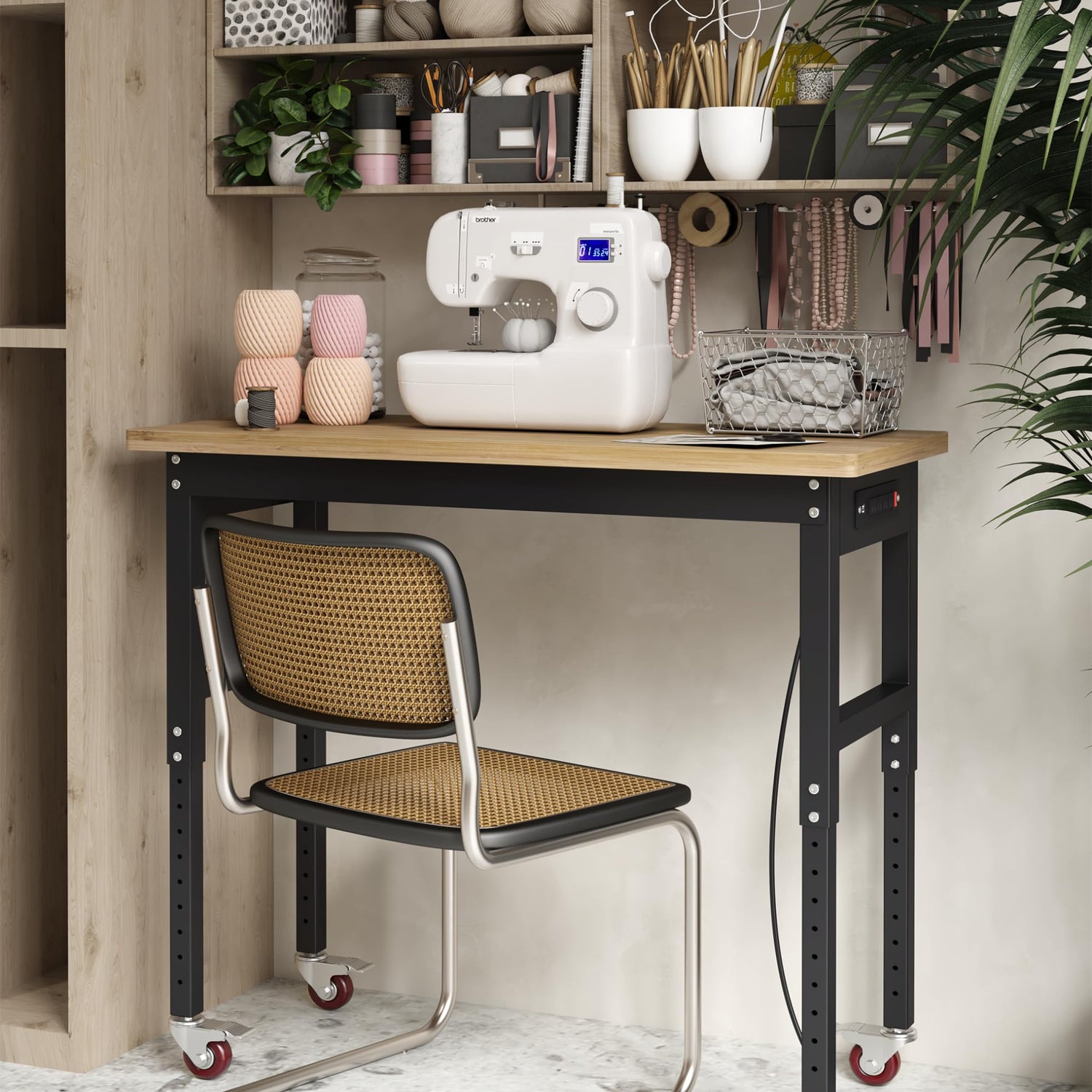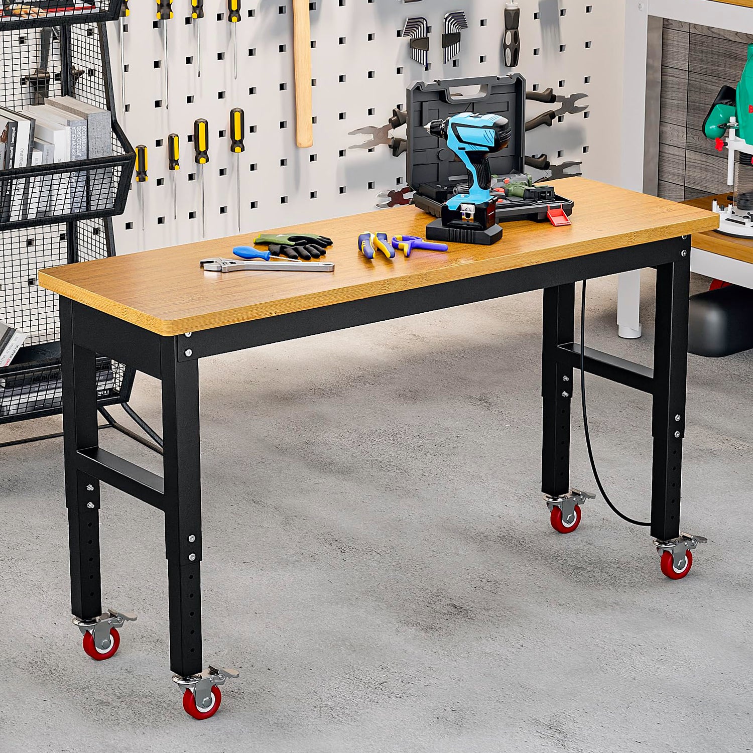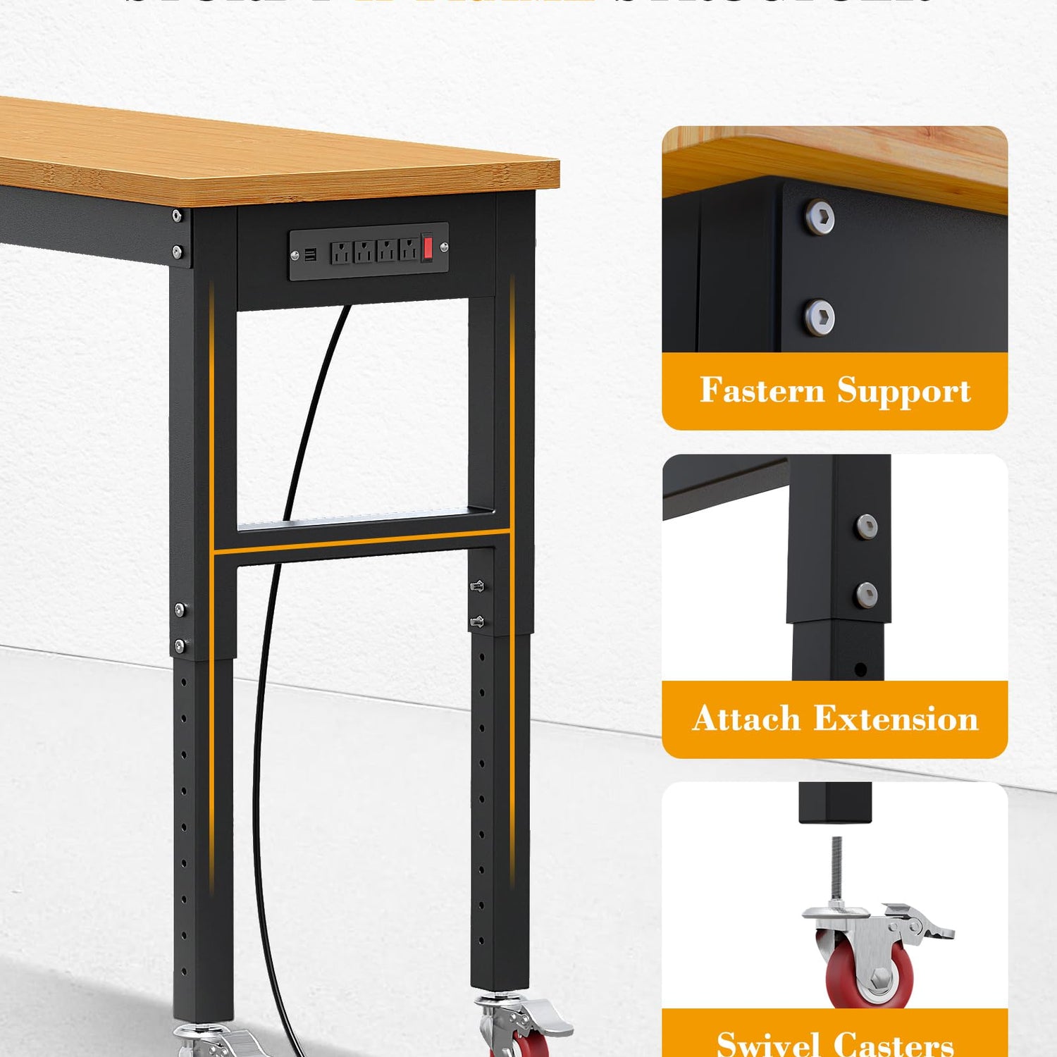 Details: GarveeTech Adjustable Height Workbench for Garage, 60" Wood Top Work Bench with Power Outlets & Wheels, 2000 Lbs Load Capacity Heavy Duty Workstation for Workshop Office Home