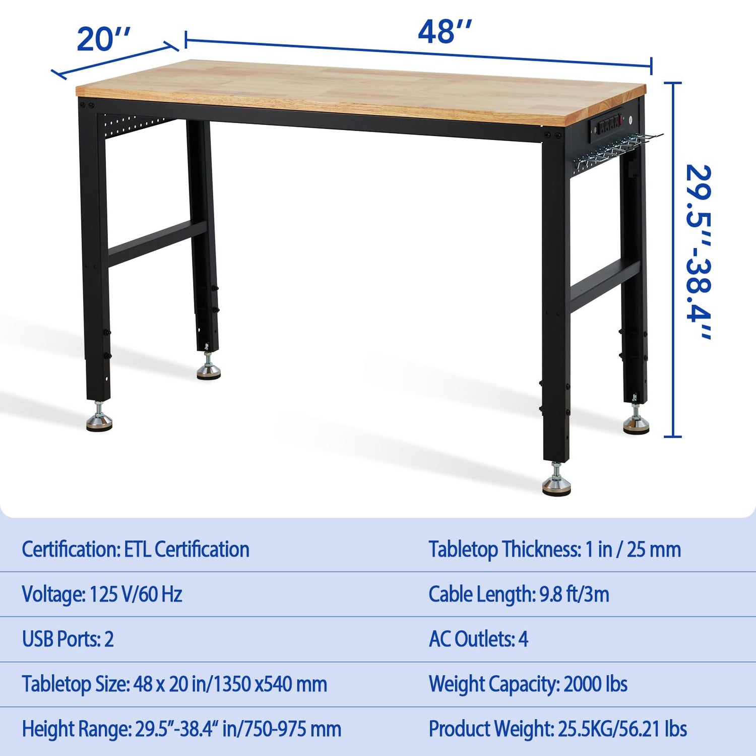 GarveeTech Adjustable Workbench 48"x20", 2000 lbs Load Capacity, Height Adjustable 29.5"-38.4", Ideal Heavy-Duty Garage Worktable with Built-in Power Outlet for Home, Office & Workshop