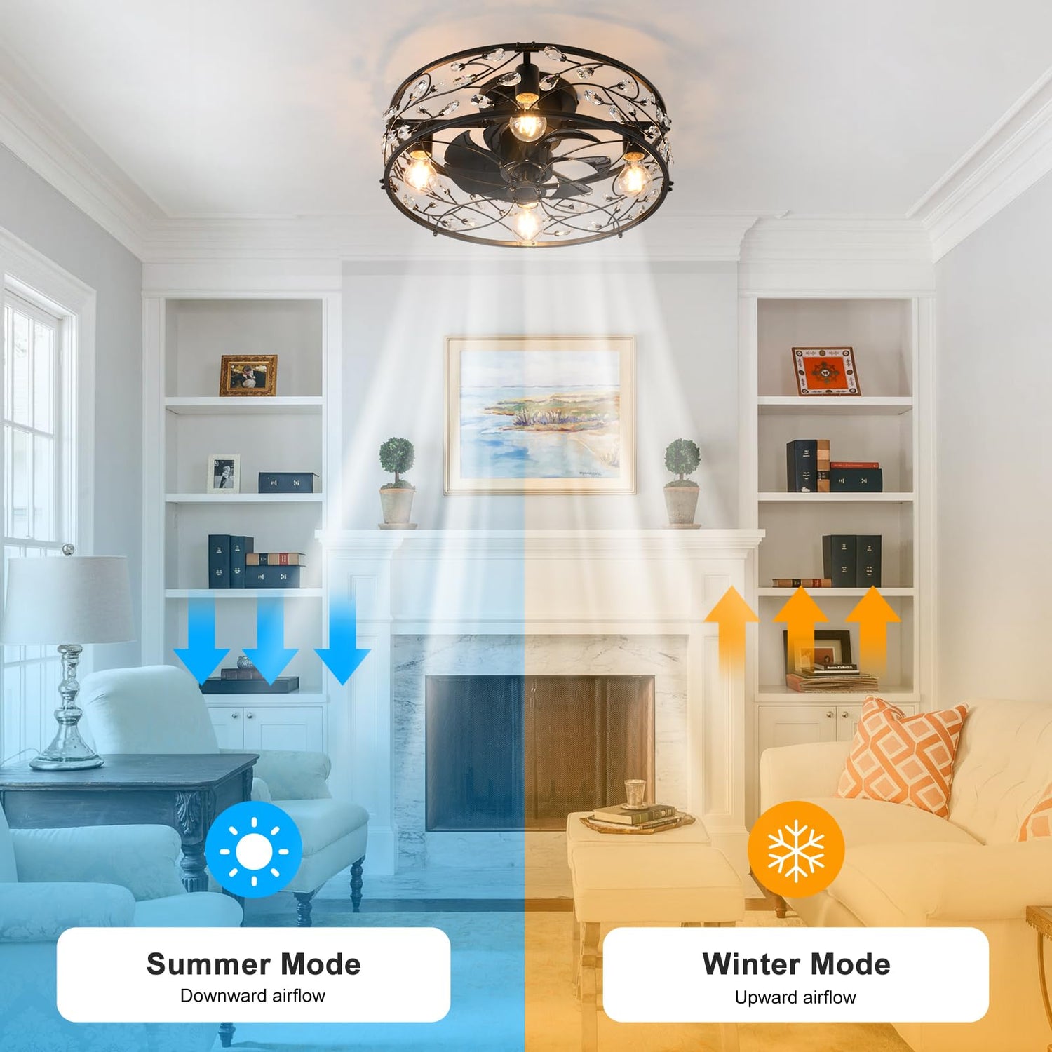 - 【Caged Design】The low profile ceiling fan has excellent coloring process and quality control, which combines practicality and aesthetics. It's designed with the farmhouse and modern style——cage shaped frame with crystals, black painted finish and branches pattern, Suitable for bedrooms, kitchen and so on, add style and function to your space, upgrade your home decor.