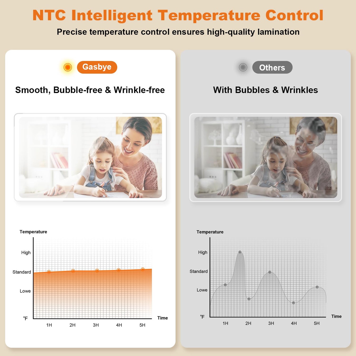 - [No Bubble and Wrinkle] Some thermal laminators cause bubbles and wrinkles due to the lack of real-time temperature control. This machine is equipped with an NTC temperature controller, ensuring better laminating quality and minimizing the formation of bubbles and wrinkles