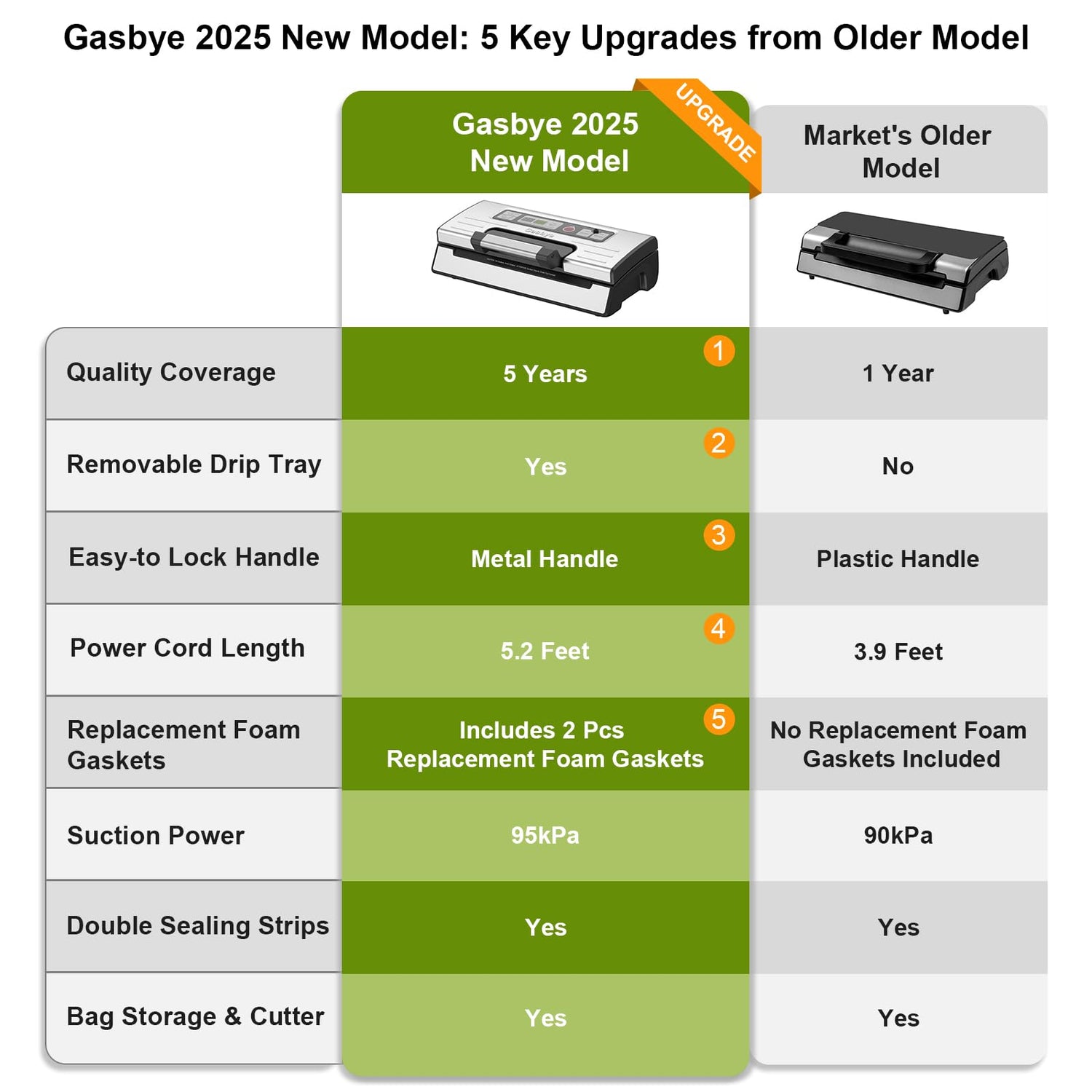 - [Double Heat Seal] The Gasbye Vacuum Sealer Machine features dual heat seals to ensure your seals remain air-tight for months. Opt between a single or double seal each use, catering to your specific preservation needs.