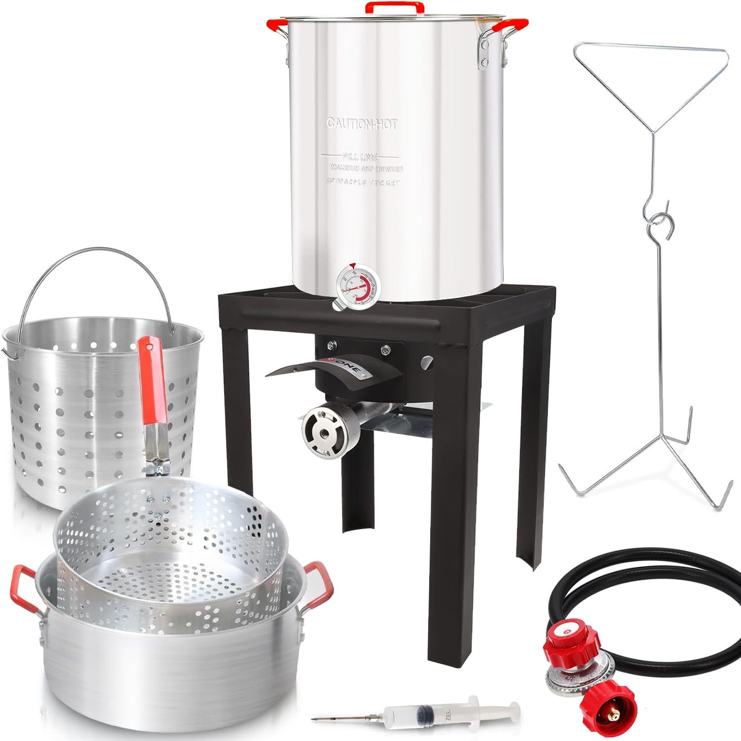 - Includes: Unleash your culinary prowess with our ultimate turkey fryer kit! Elevate your cooking game with a 30 Qt. Pot, 10 Qt. Pot, Lid, Perforated Fryer Steamer Basket, Temperature Thermometer, Perforated Turkey Rack, Lifting Hook, Marinade Injector, Burner Stand, LP Hose, and Regulator. Master flavor infusion, ensure safety, and become the hero of every feast with this all-inclusive set!