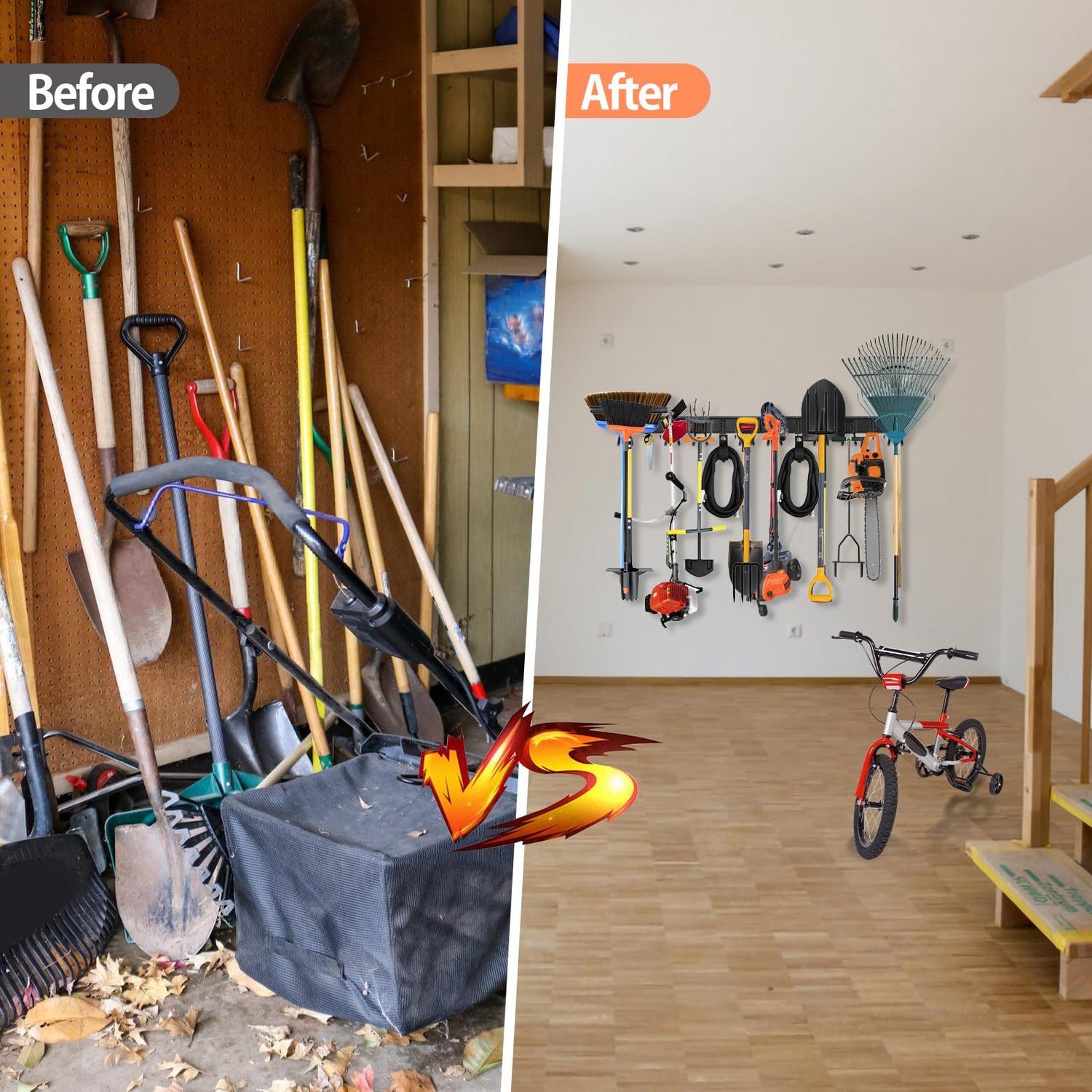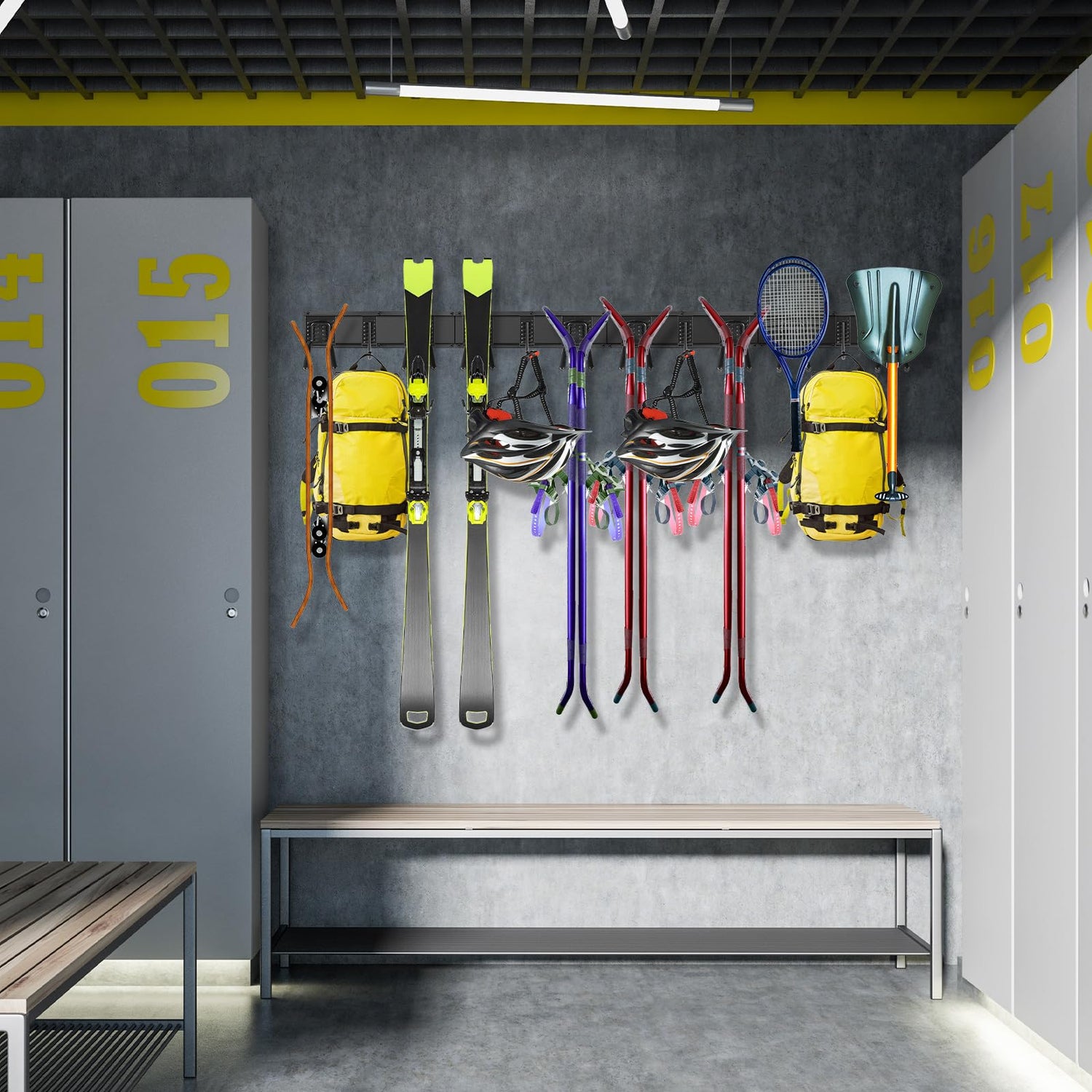- VERSATILE GARAGE TOOL ORGANIZER: This wall-mounted organizer offers exceptional organization for residential, commercial, and storage spaces. It is designed to hang various items such as garden tools, shovels, rakes, brooms, mops, extension cords, hoses, power tools, as well as sporting equipment like helmets, boots, ice skates hockey sticks and ski gear.