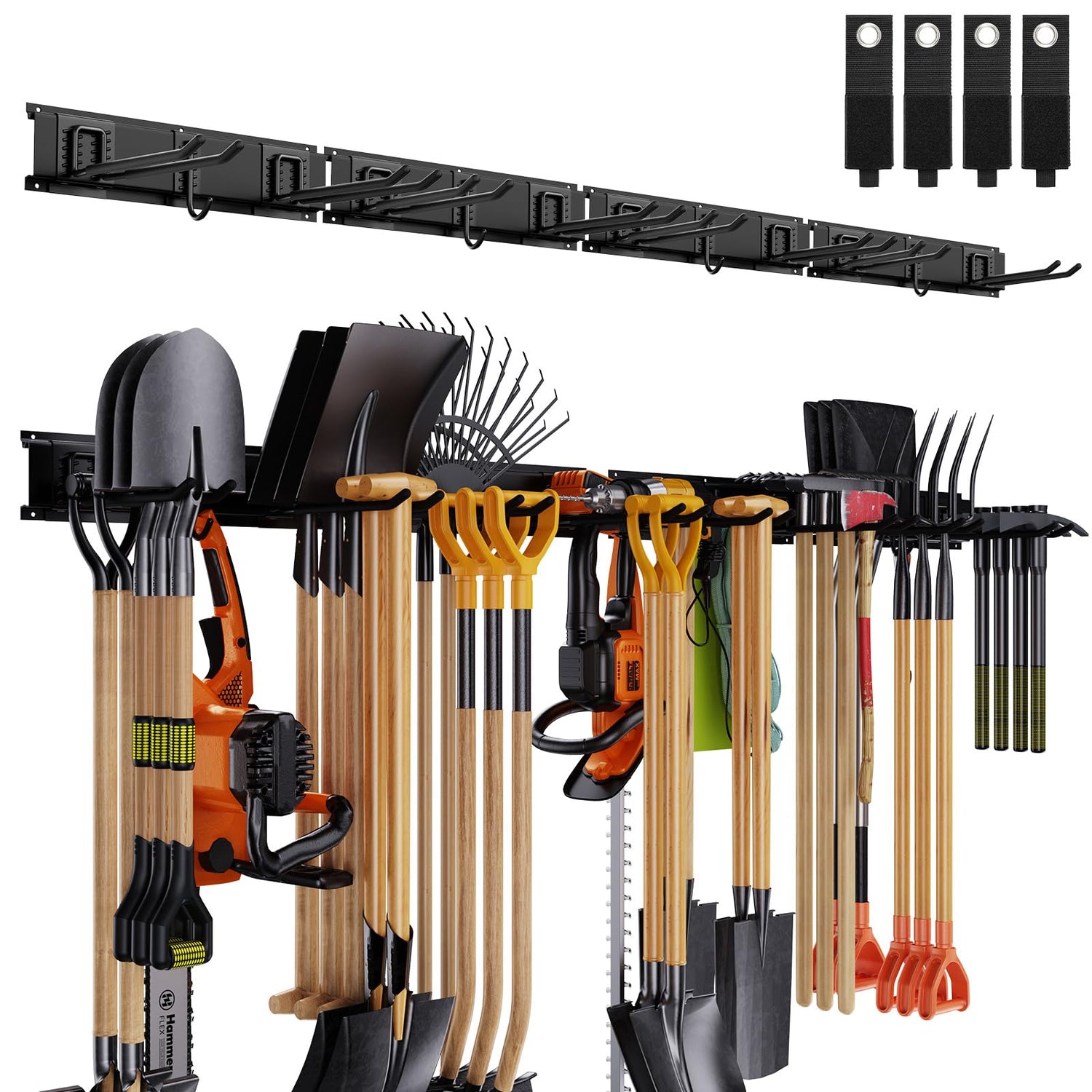 - 12 HOOKS & 4 RAILS & 4 STORAGE STRAPS: The garage wall organizer includes 12 hooks, 4 rails, and 4 storage straps. It consists of 8 double long hooks(8.15inch), 4 little 'J' hooks, and 4 storage straps. The slide rails can accommodate 2-3 hooks each without appearing overcrowded. The spacing on the 64" steel rail (consisting of 4 panels) can be customized to suit individual needs.