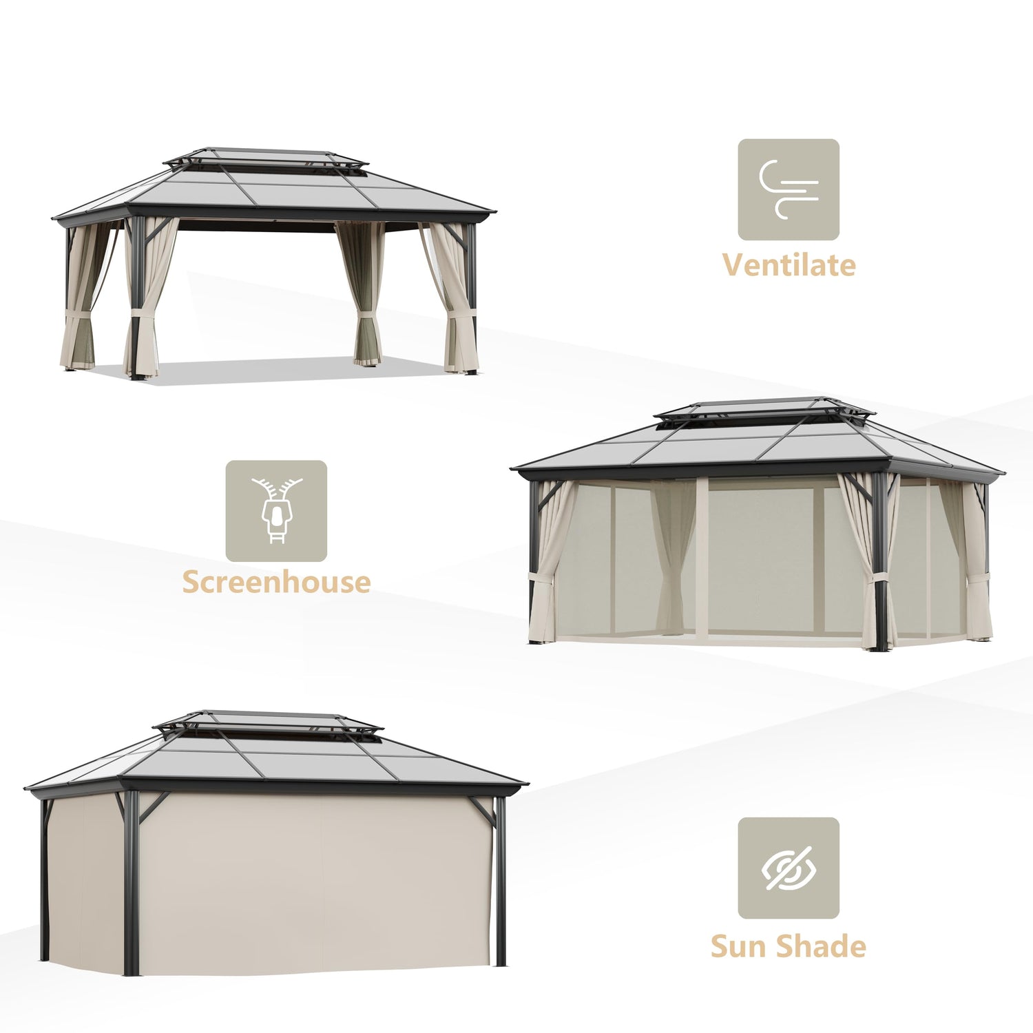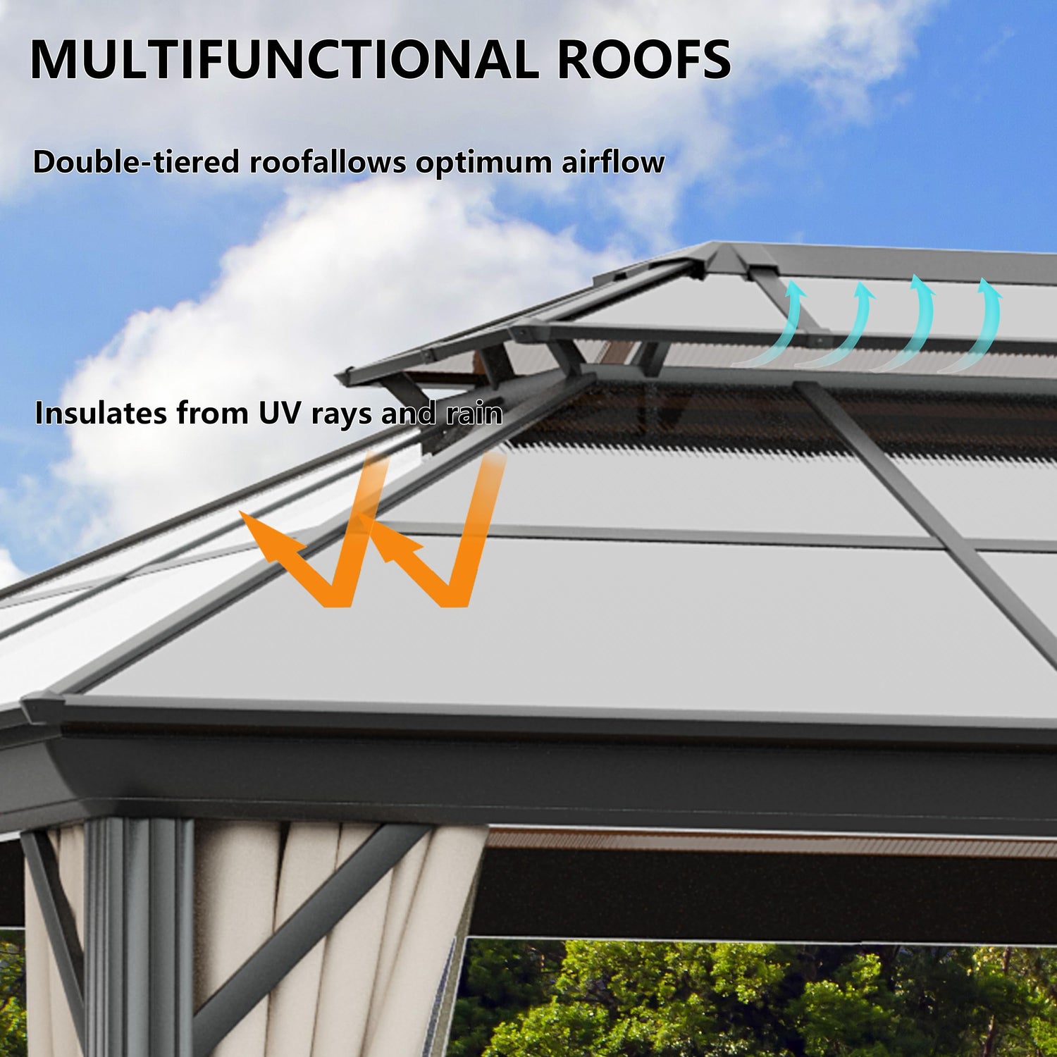 - DUAL-LAYER POLYCARBONATE ROOF - Our hardtop gazebo features a dual-layer roof to allow better air circulation. High-quality polycarbonate panels can filter out 99% of harmful UV rays to protect you in the hot summer. Three hooks inside the roof can be used to hang fans, lights and decorations.