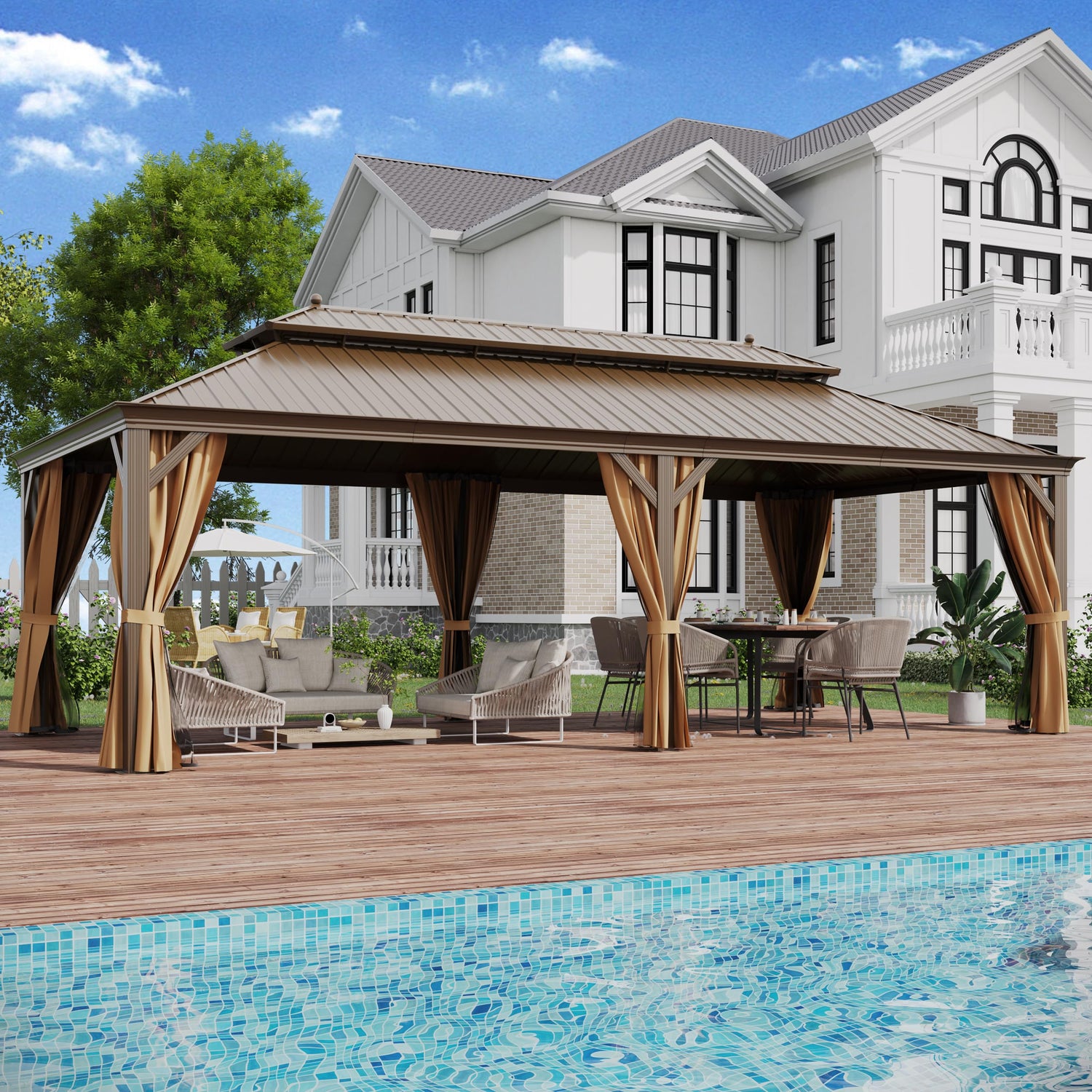 GAZEBEST 12' X 24' Permanent Hardtop Gazebo, Outdoor Galvanized Steel Double Roof Pavilion Pergola Canopy with Aluminum Frame and Privacy Curtains for Garden Patio,Patio Backyard,Deck and Lawns