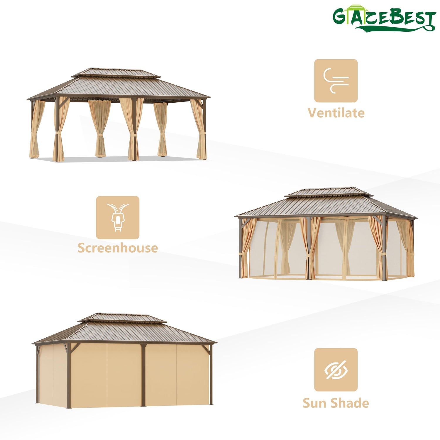 GAZEBEST 12x18 ft Hardtop Gazebo Outdoor Aluminum Patio Gazebo Double Roof Galvanized Steel Gazebo Canopy with Netting and Curtains,for Garden Patio,Patio Backyard,Deck and Lawns