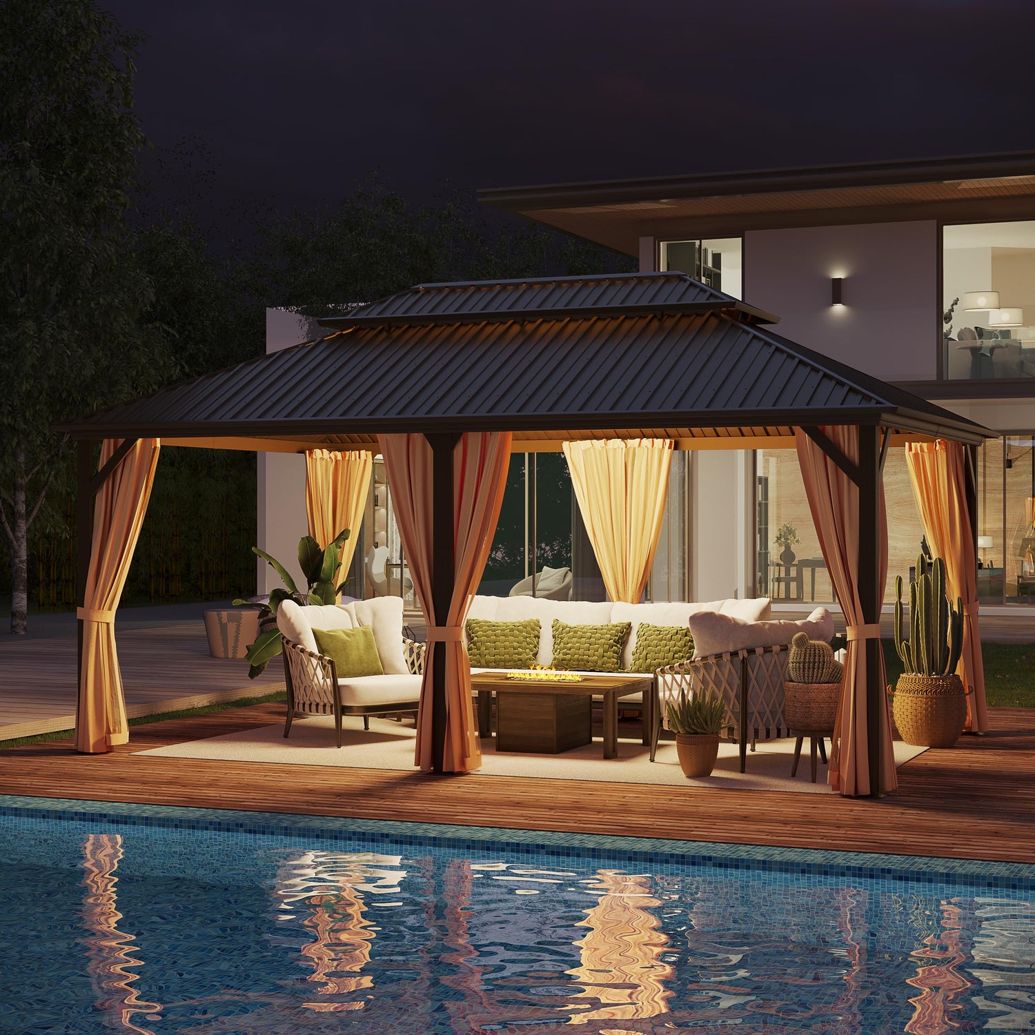 - DUAL-LAYER METAL ROOF - Our hardtop gazebo features a dual-layer roof with inner netting to allow better air circulation. Instead of fabric or polycarbonate material, the galvanized steel panels are firmer to withhold harmful UV rays, strong wind and snow to protect you in all weather. Three hooks inside the roof can be used to hang fans, lights and decorations.