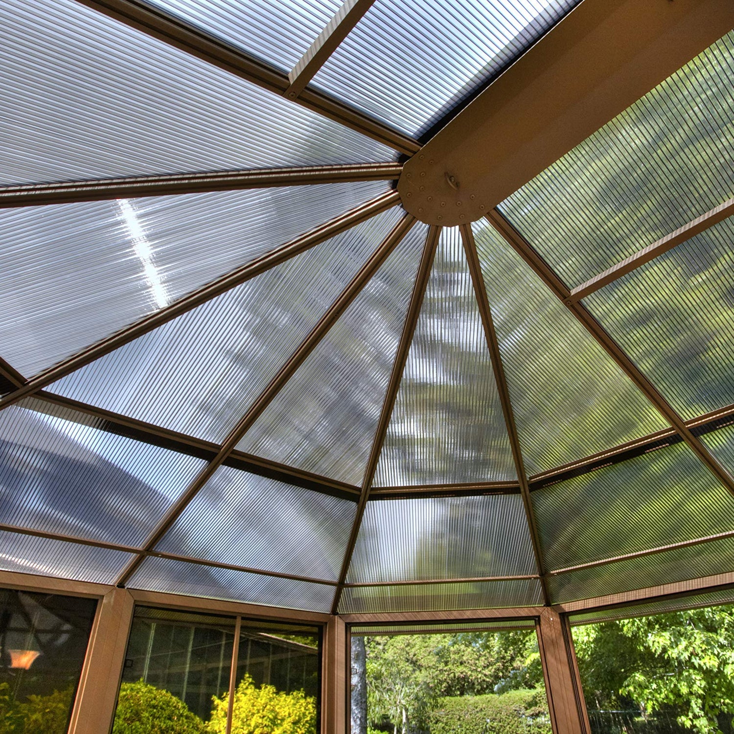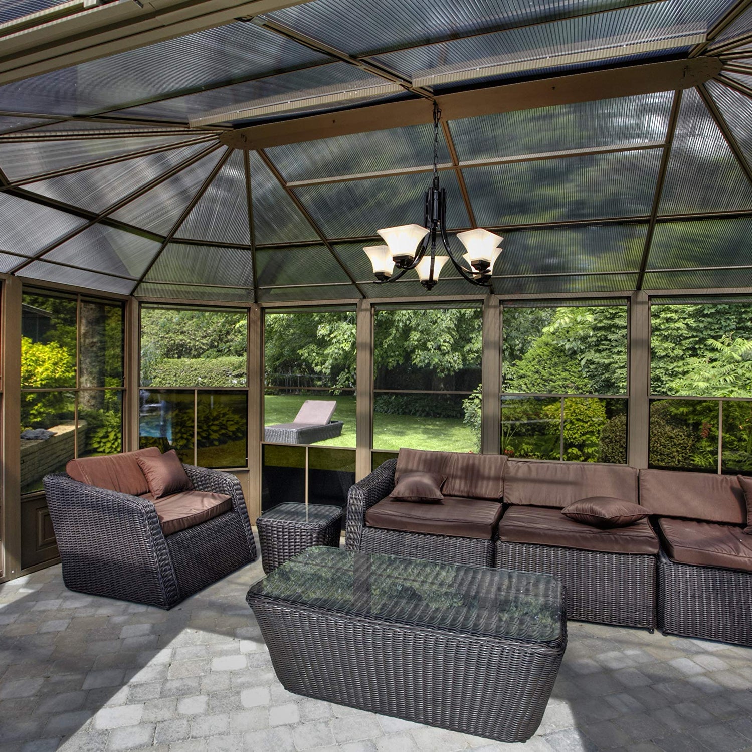 Details: Extend the enjoyment of your outdoor space with our solarium. This unit can be left up year round, saving yourself the trouble of assembling and disassembling at the end of the season. The solarium is constructed of aluminum and features a reinforced polycarbonate roof, two sliding doors and 5-position wind panels. This unit has been carefully designed to withstand exposure to rain, snow and harsh UV rays. This item is not insulated but you can still enjoy the extra lounge space to accommodate friends and family during various social festivities and relaxing spa days.