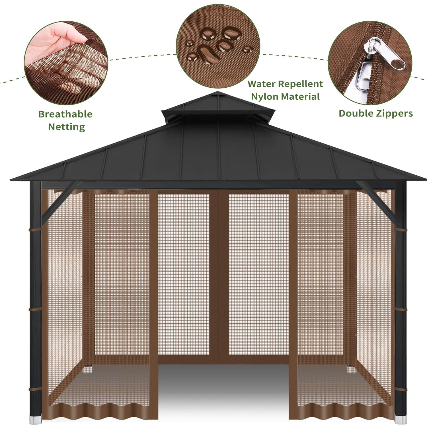 Details: Gazebo Universal Replacement Mosquito Netting, 10' x 10' Outdoor Canopy Net Screen 4-Panel Sidewall gazebo curtains, with Zippers, Easy to Install, Fit for Most Gazebo 10x10 Canopy,Patio (Brown)