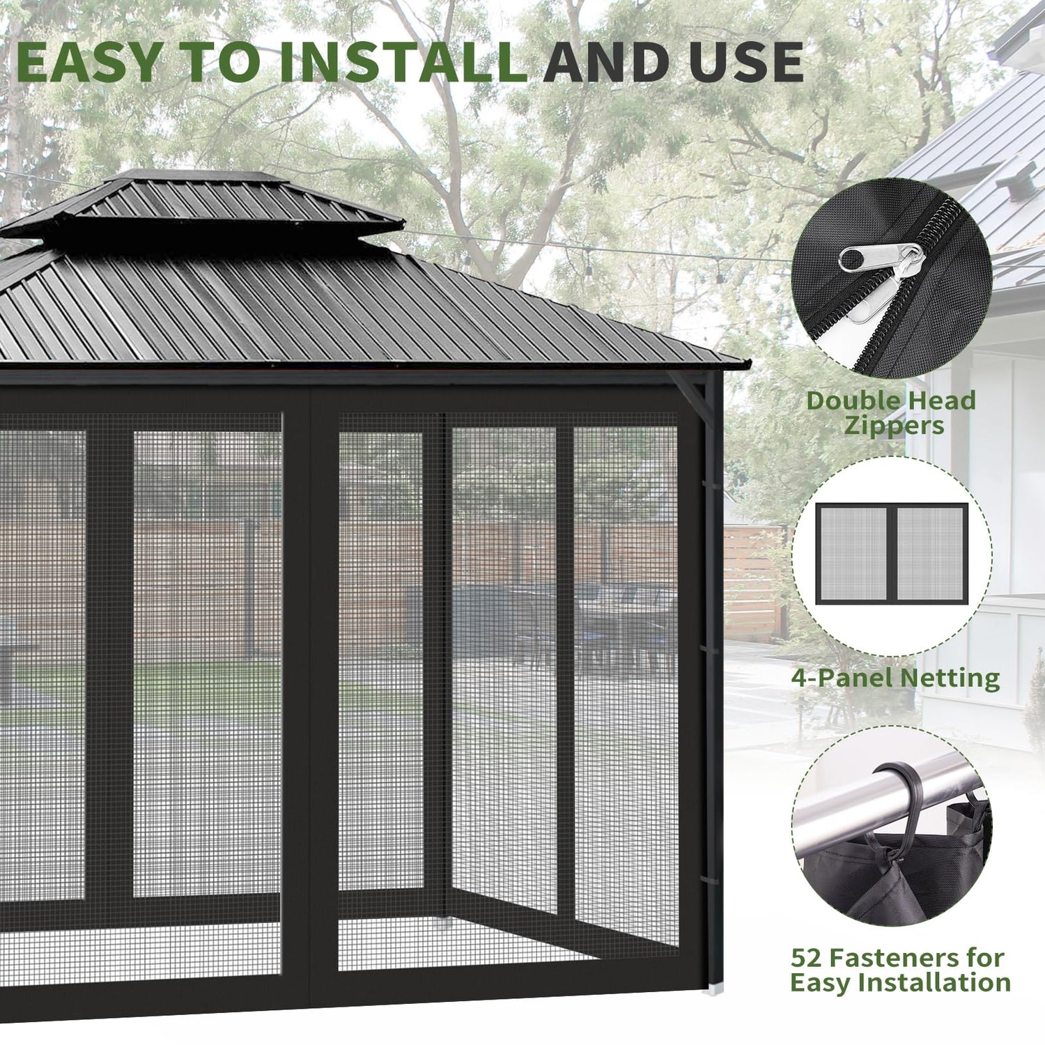 - Easy to Install: The double-head zipper on each side of the outdoor canopy mesh curtanin can be pulled inside and outside, which is convenient for your entering and exiting the gazebo. The package also comes with plastic hooks and rings for your easily attaching the netting panels on your gazebos.