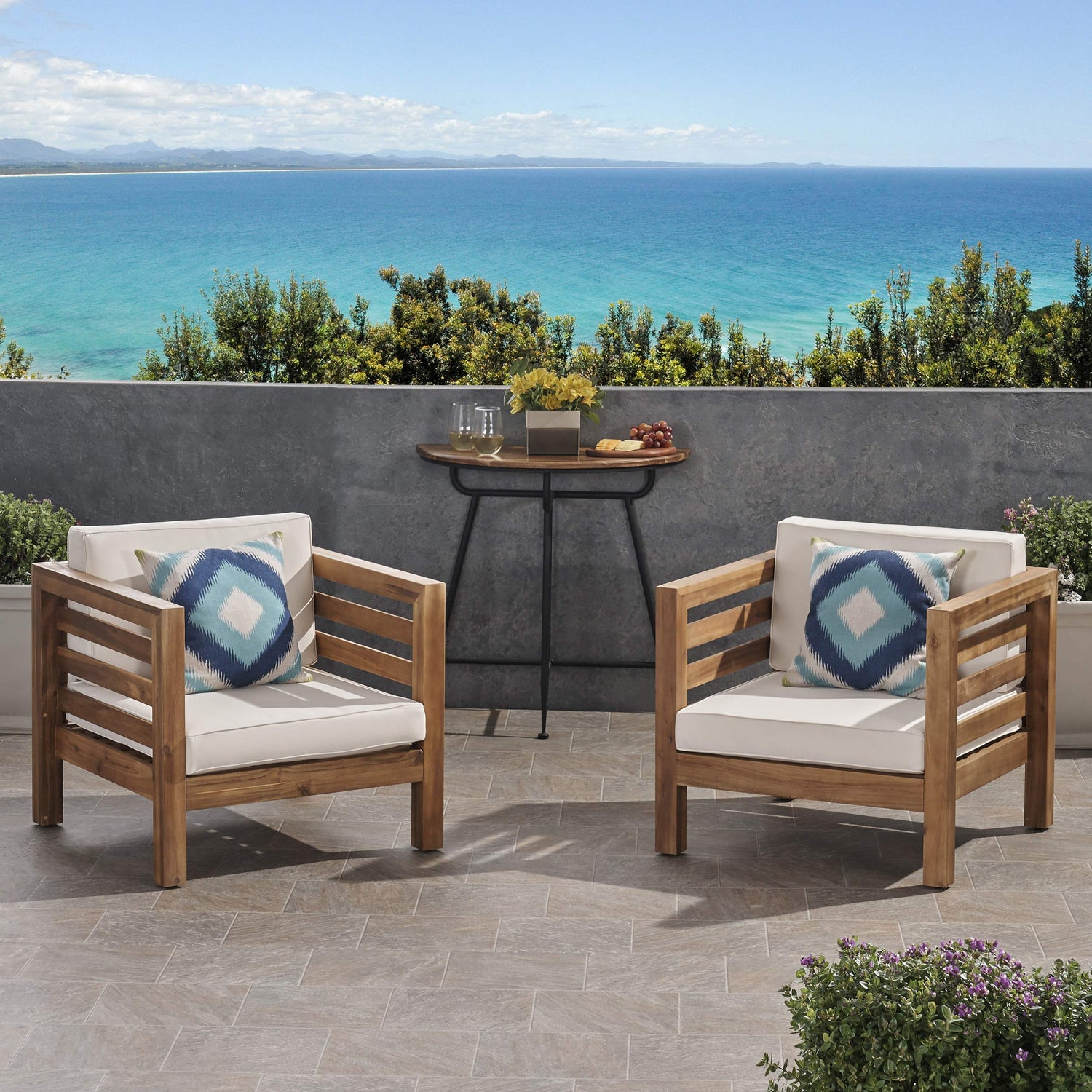 GDFStudio Louise Outdoor Acacia Wood Club Chairs with Cushions (Set of 2), Teak Finish and Beige