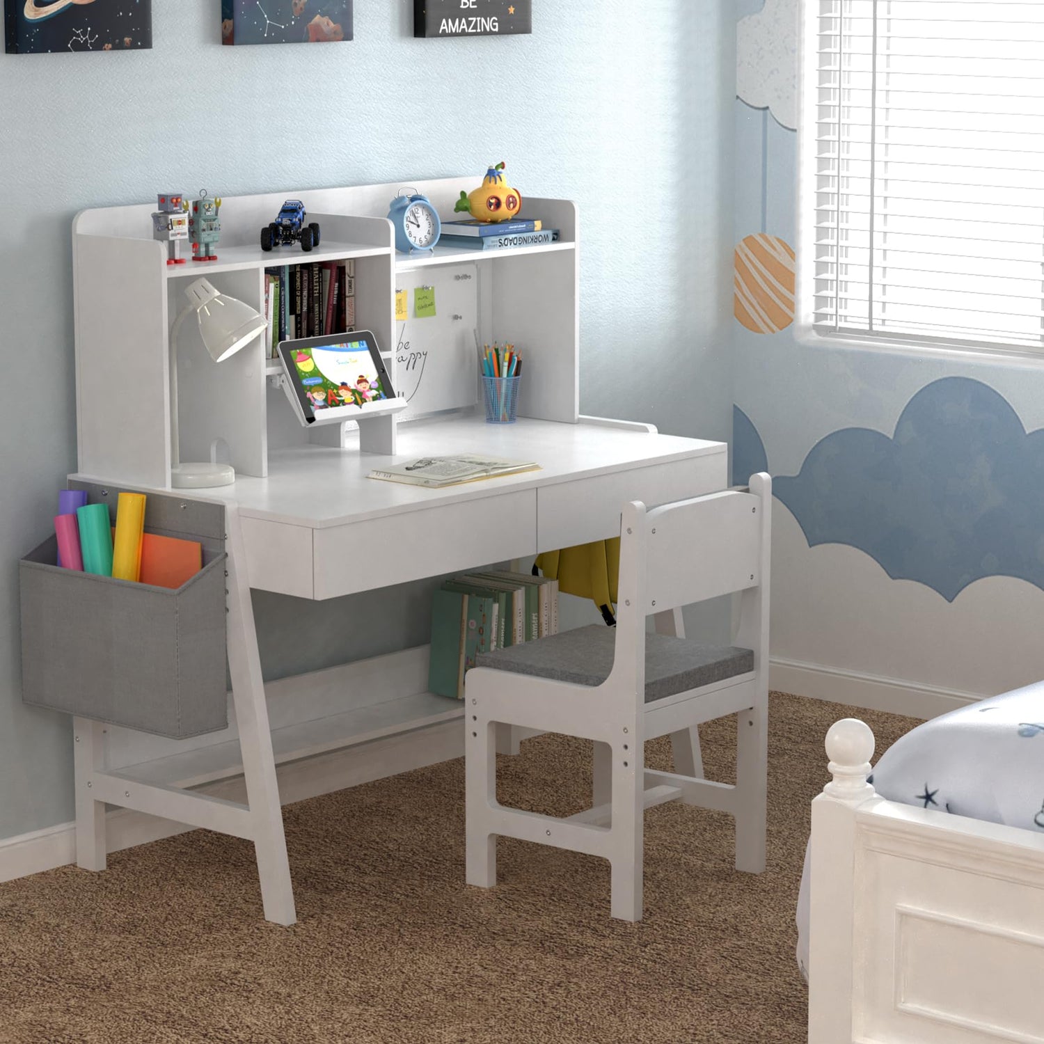 - Ample Storage Space: This 44" x 23.6" youth desk provides enough room for creative projects, featuring a hutch for essentials, two drawers for organized storage, a side fabric bag, and a bottom shelf for books, files, and other school supplies. Your child will have everything they need to stay organized and focused.