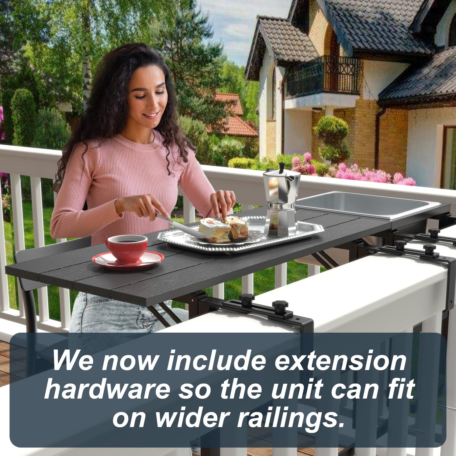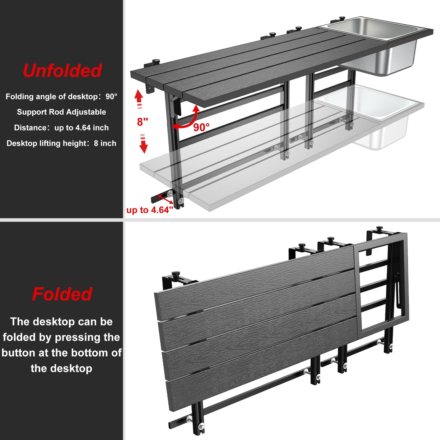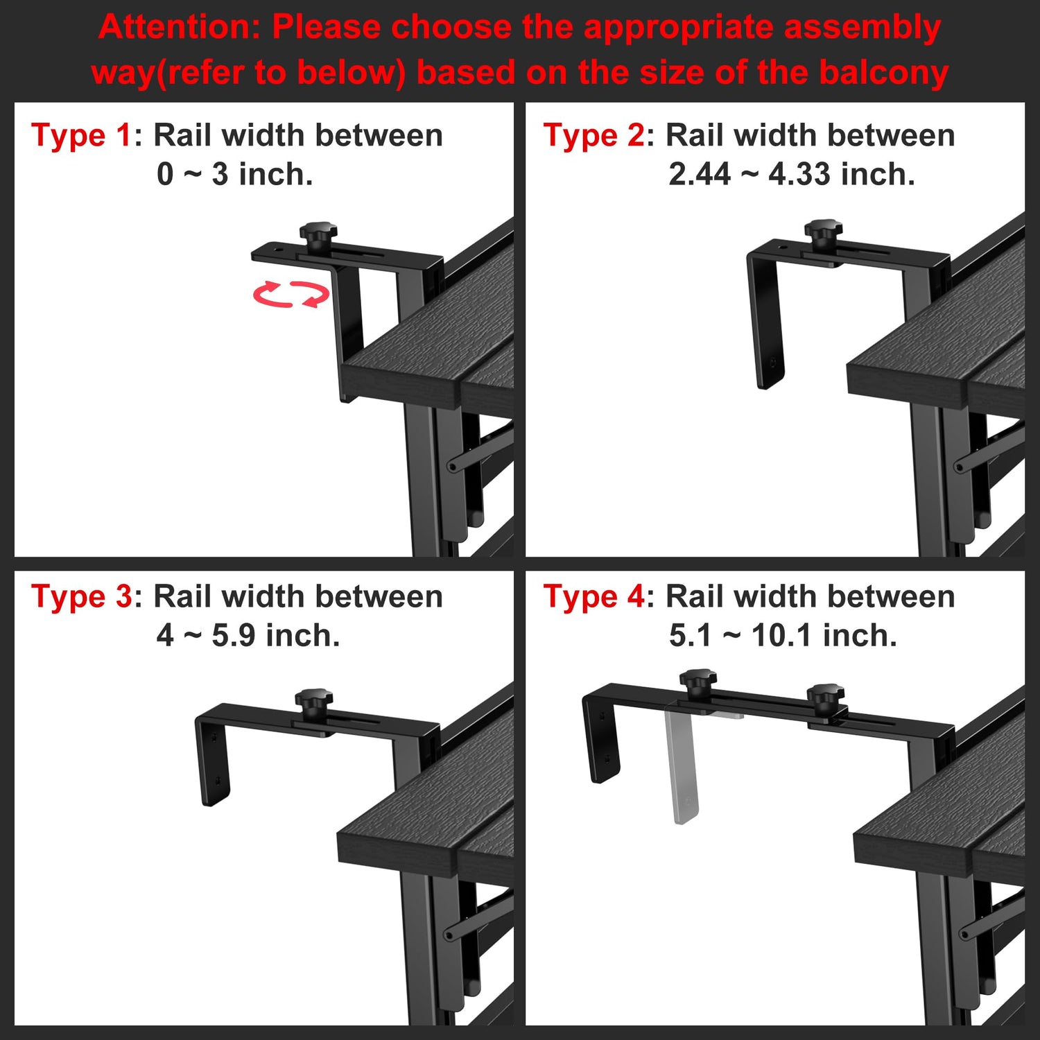 - Easy Assembly & Adjustable: You can set up the table within 10 minutes! This balcony table can be applied to railings of different widths through different screw holes as shown from listing pictures. "IMPORTANT: Please measure your balcony railing to ensure this unit will fit properly. See image #4 for details. At the same time, the height of the desktop can be adjusted easily up and down according to the instructions.