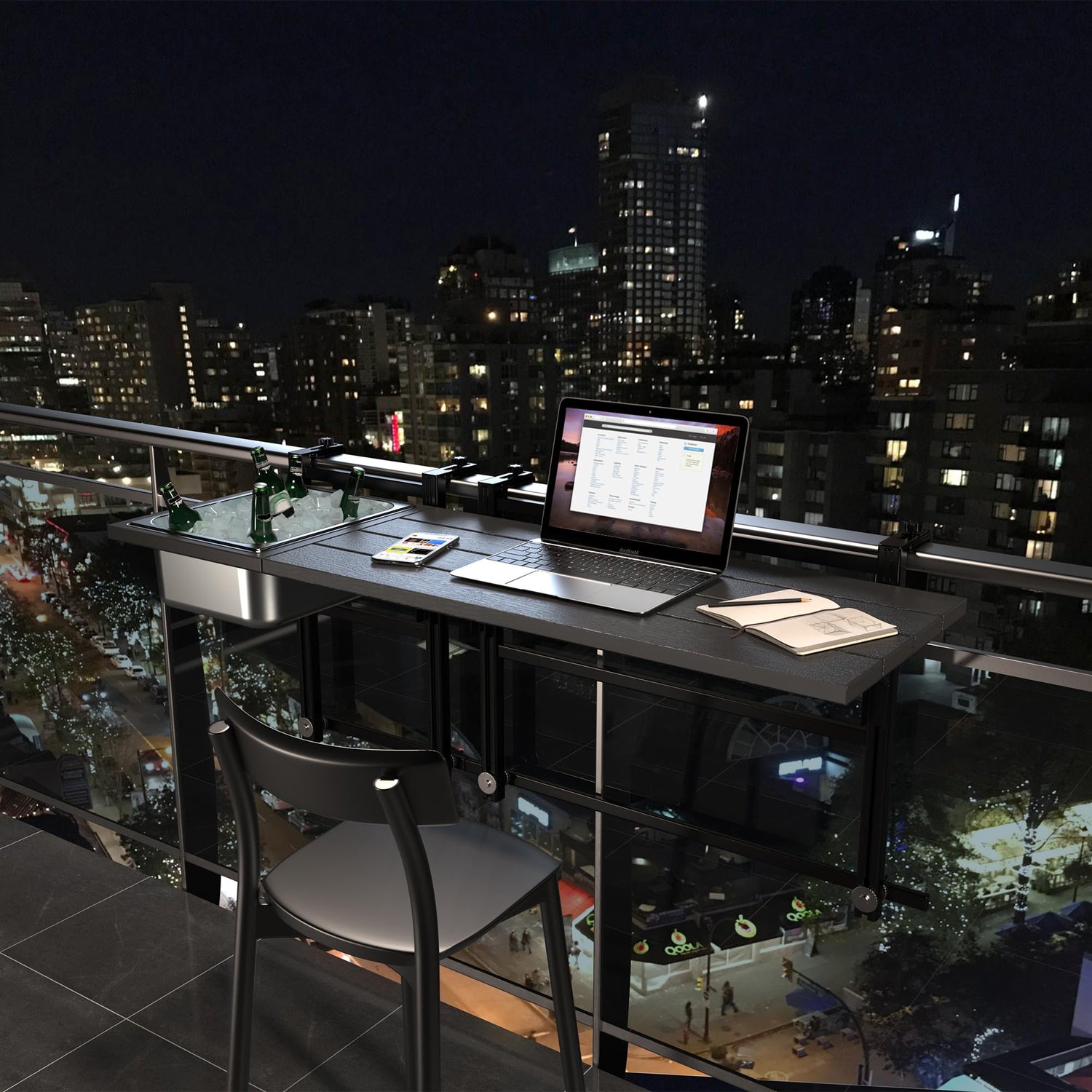 - Enjoy Your Balcony Space more! No longer need to worry about your balcony space being too small. Table can be propped up or put down in a folded state with one step. This Balcony Table with long bar design and removable ice bucket, creates a great place to enjoy drinks,meals, reading, etc.