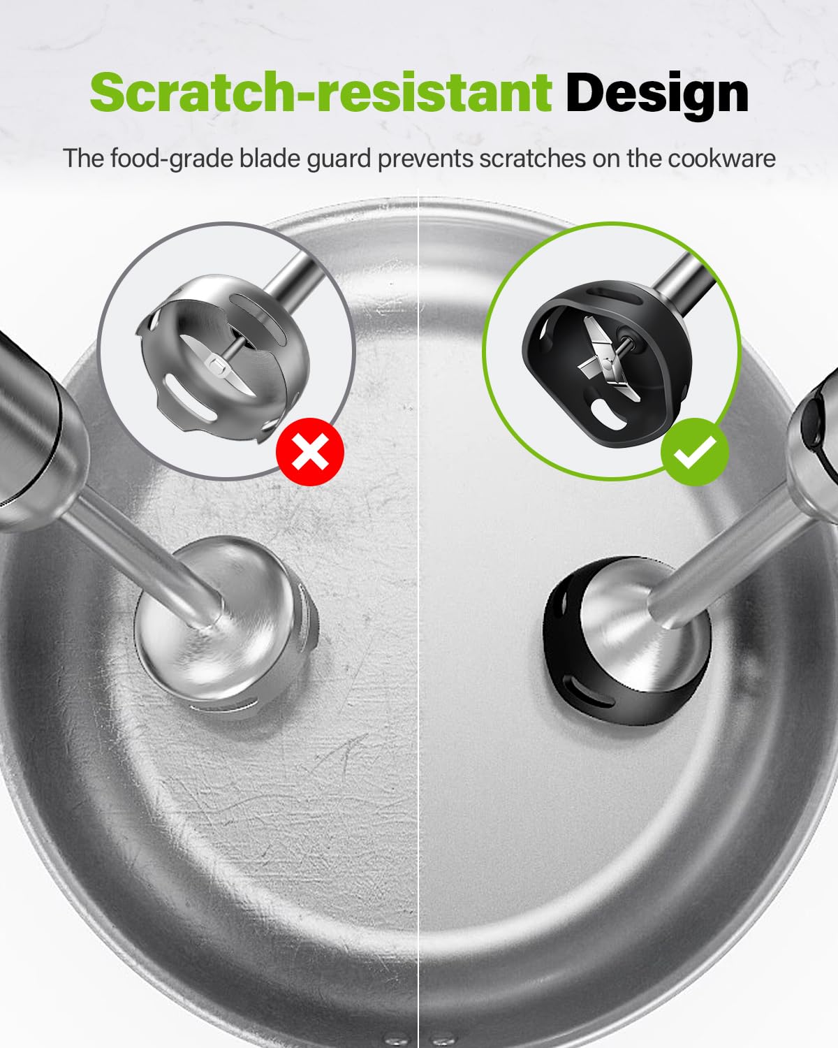 - 【Prevent Container Scratches and Splatters】- The immersion blender has a scratch-resistant blade guard, meaning you can blend in your containers without fear of scratching. The bell-shaped guard minimizes splattering and ensures rapid and finer results