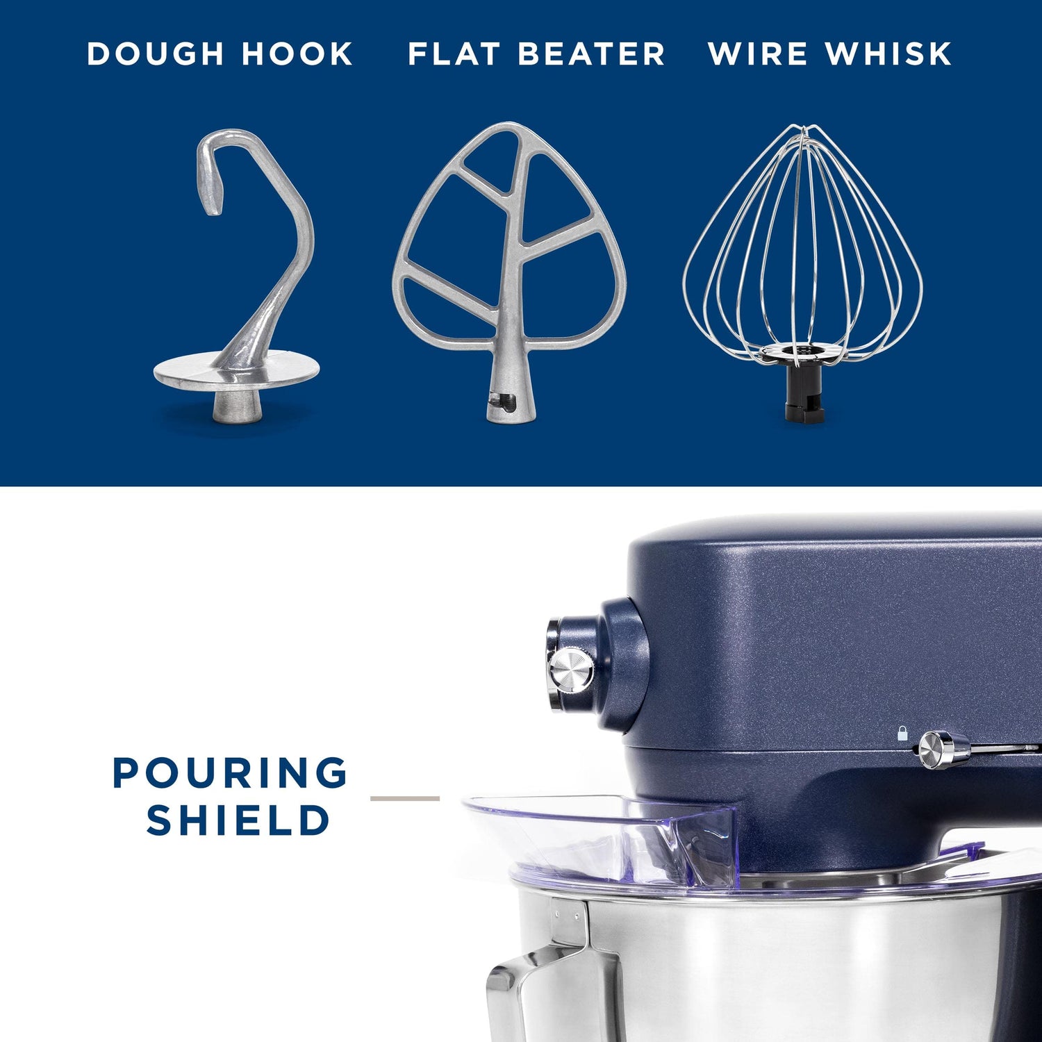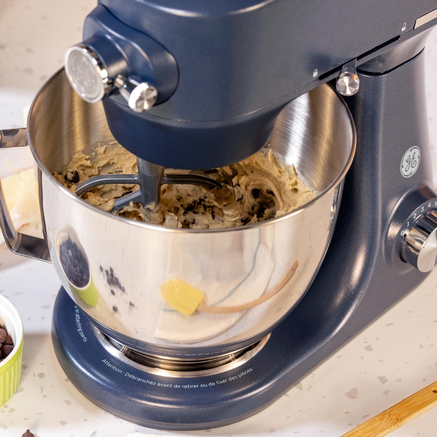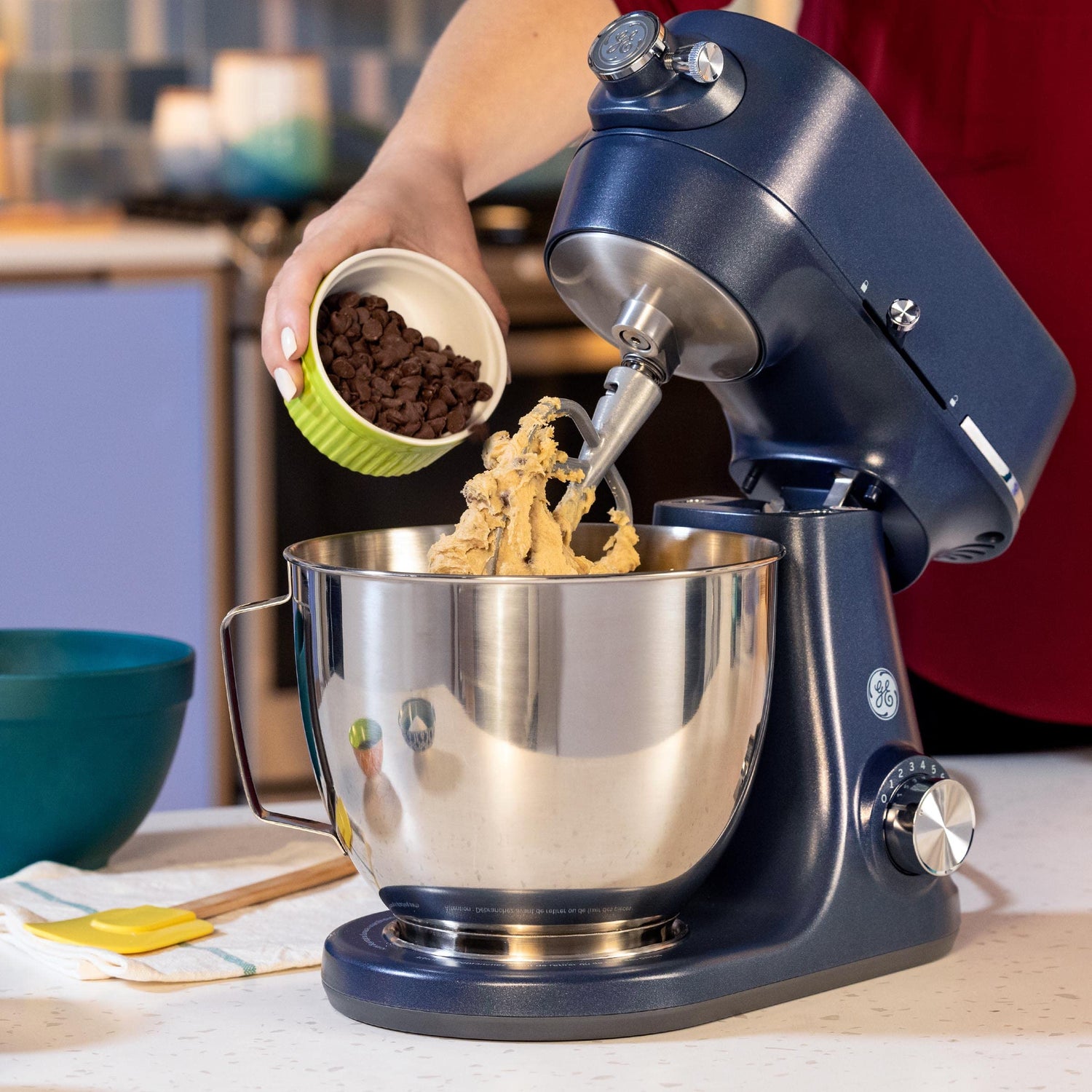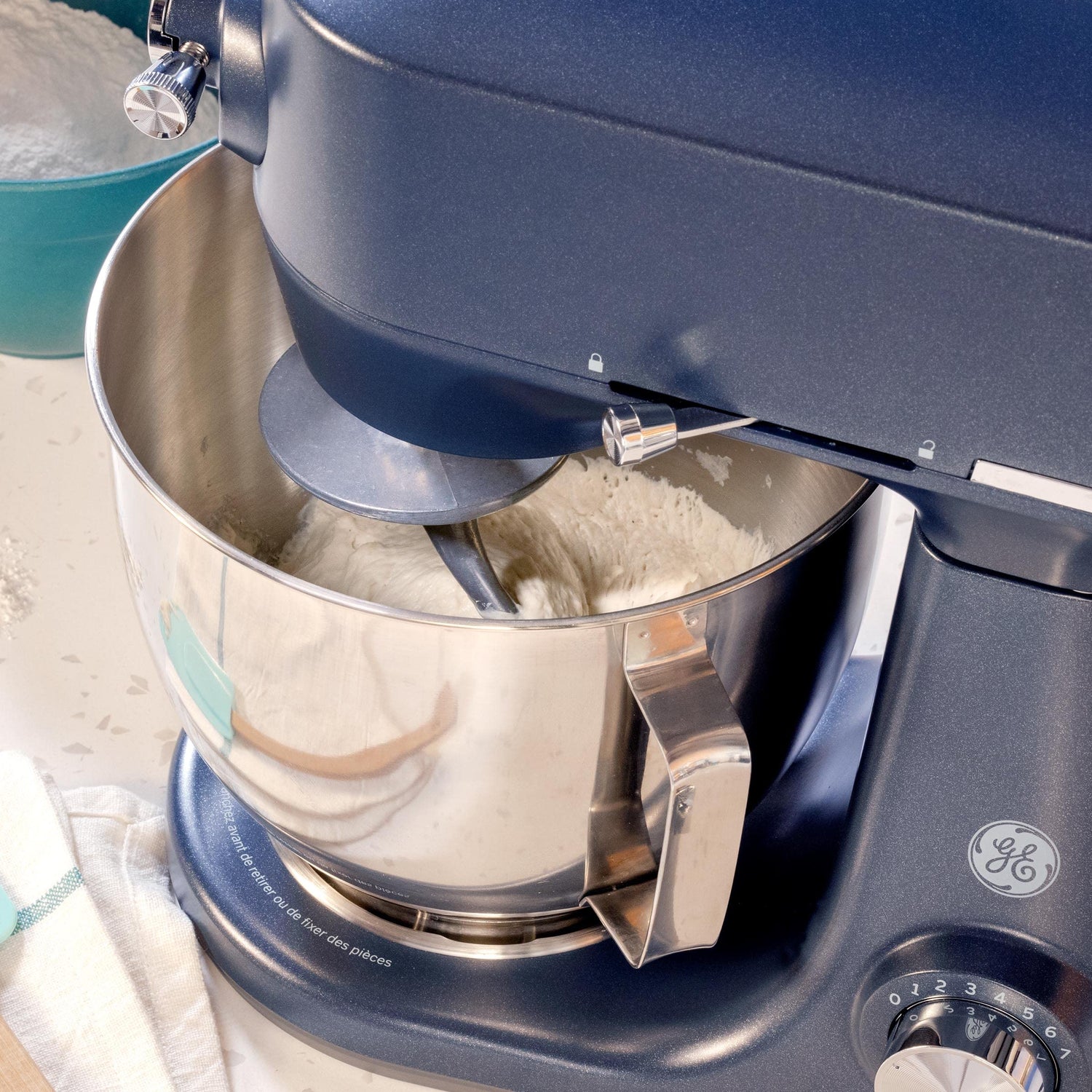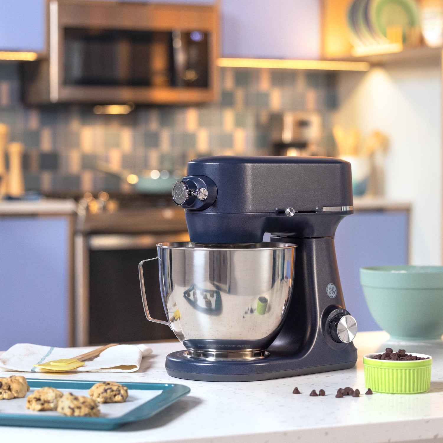 GE Tilt-Head Electric Stand Mixer | 7-Speed, 350-Watt Motor | Includes 5.3-Quart Bowl, Flat Beater, Dough Hook, Wire Whisk & Pouring Shield | Countertop Kitchen Essentials | Sapphire Blue
