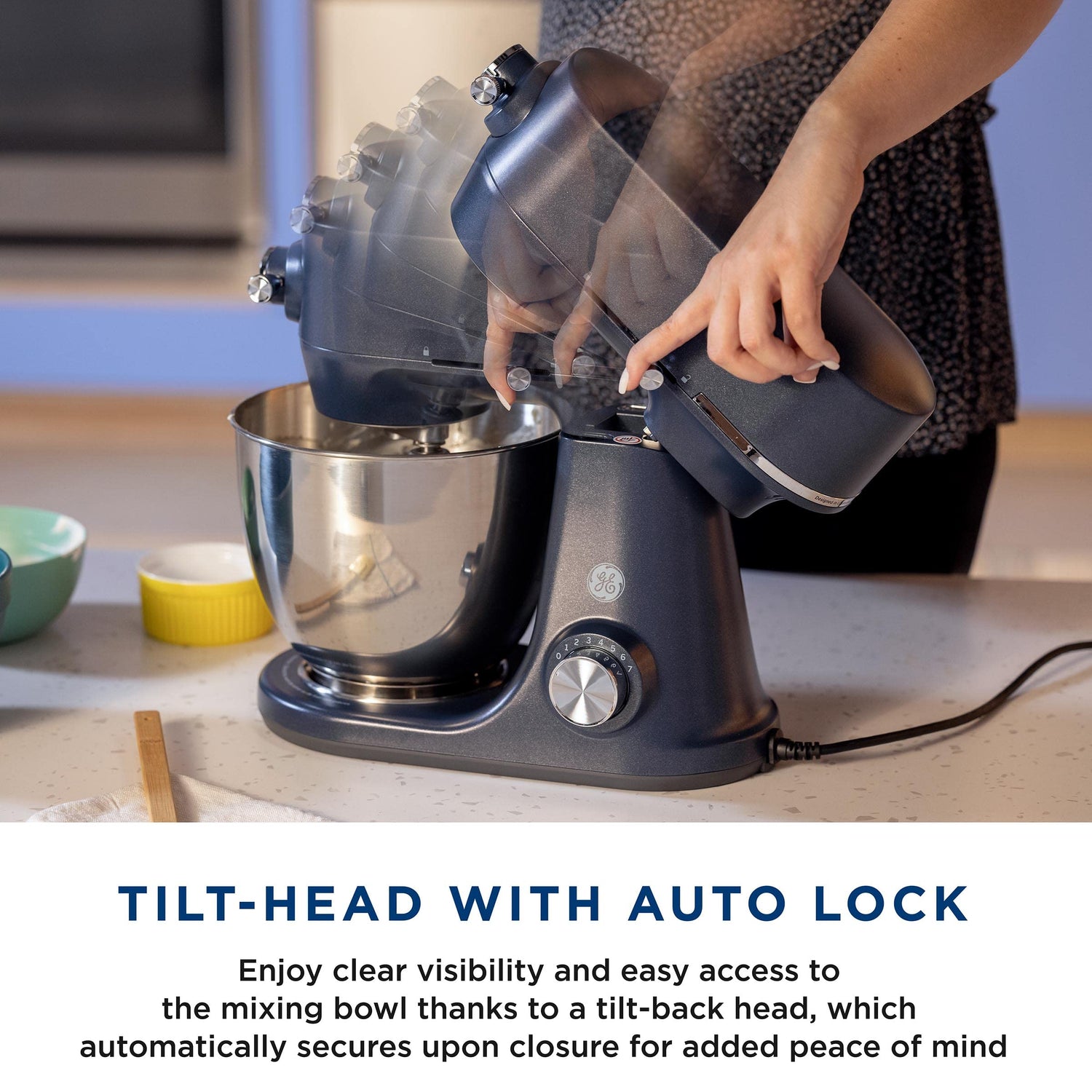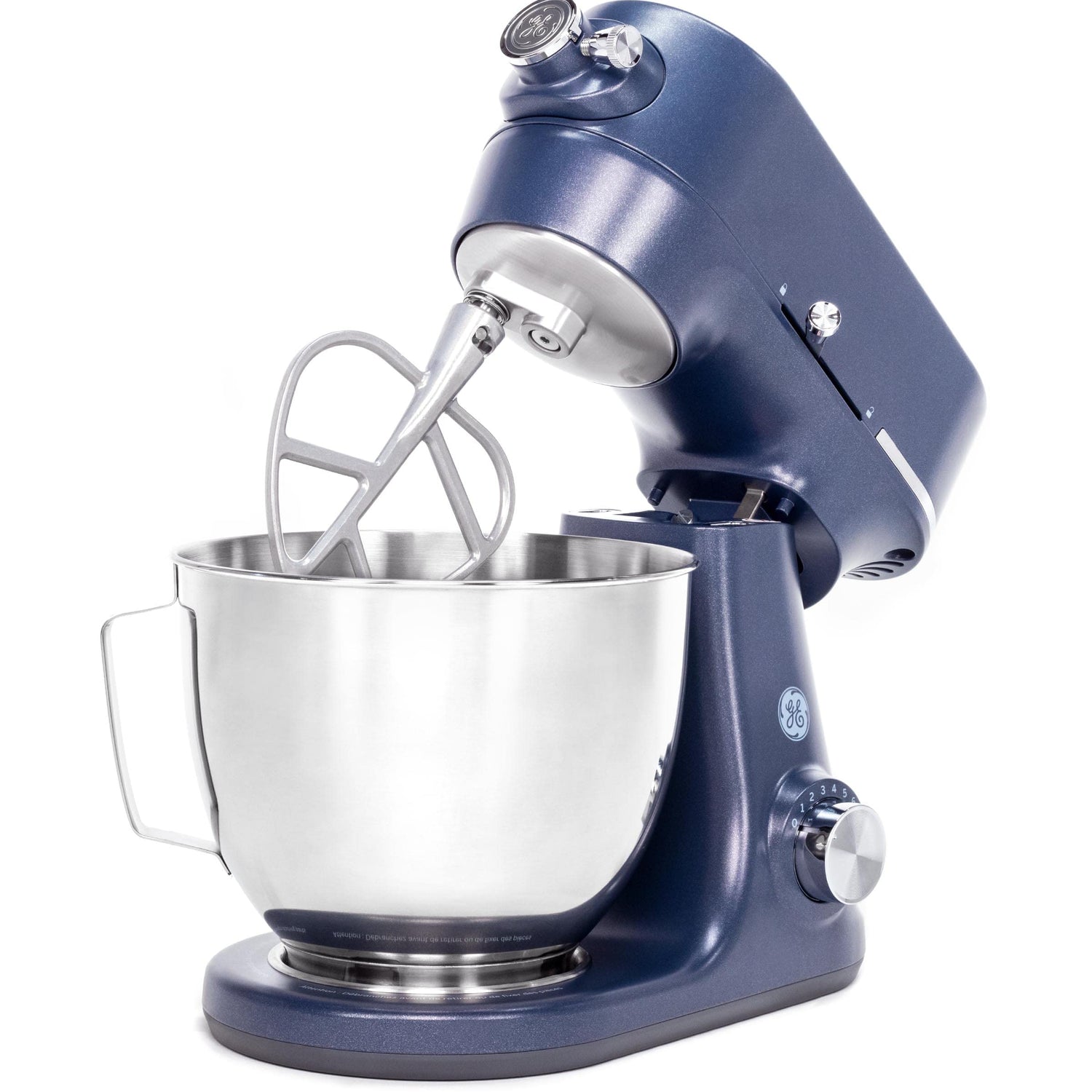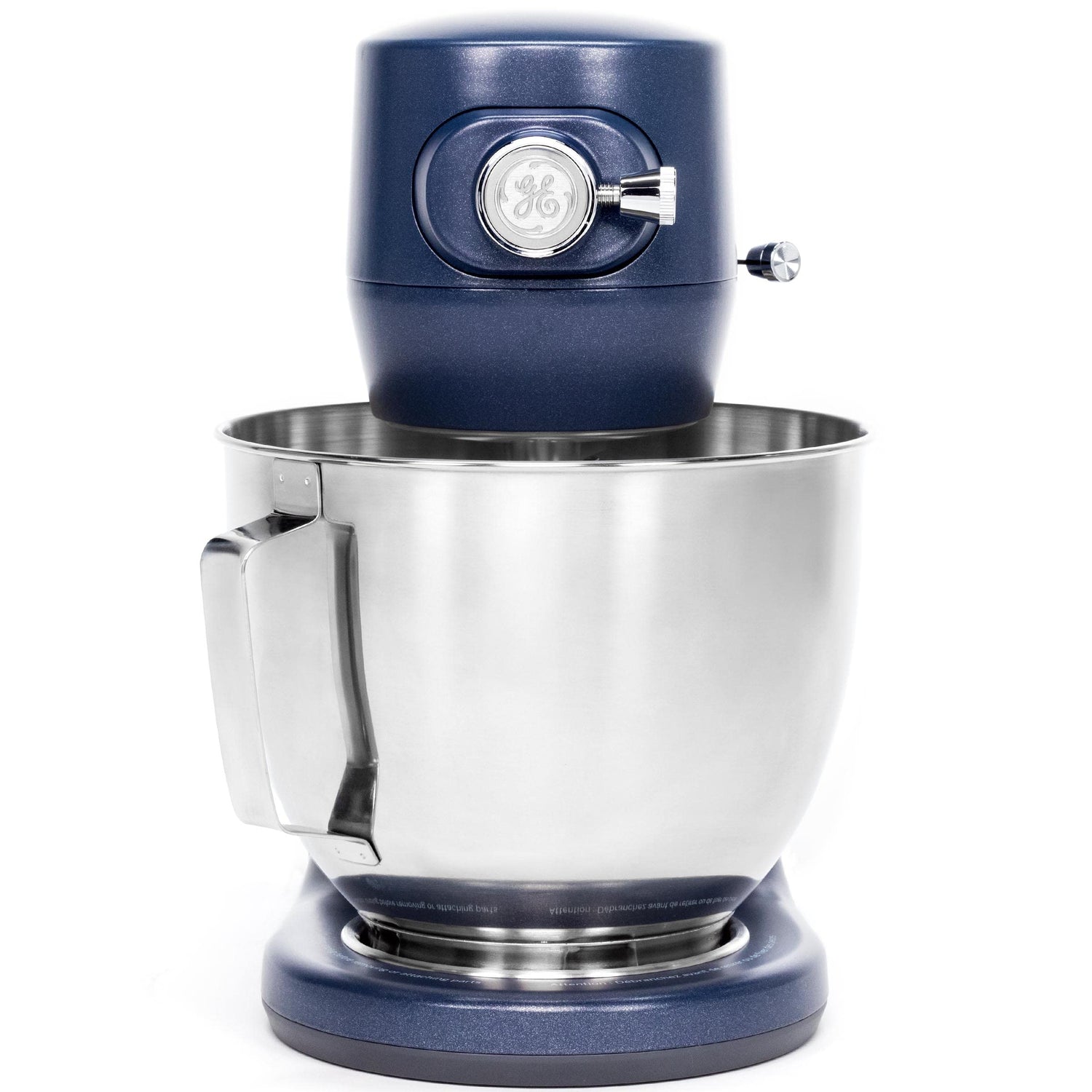 Details: The GE Tilt-Head Stand Mixer offers a timeless, easy to use kitchen essential, perfect for everyday baking needs. With 7 optimized speeds and 5.3 qt. capacity, this mixer is engineered for tackling hundreds of tasks from cookies and ciabatta, to fettuccini al dente. The powerful 350-watt motor and robust die-cast metal construction mean this mixer can handle even your largest holiday batches. Enjoy clear visibility and easy access to the mixing bowl thanks to a tilt-back head, which automatically secures upon closure for added peace of mind.? No need to worry about flour messes and batter splatter thanks to a soft start motor that eases the mixer into powerful performance, no matter which speed you choose.? Turn this mixer into a kitchen multi-tool by using your current mixer attachments, including third-party accessories, so you have the versatility you need to make what�s good, tonight. ?Components include a 5.3 qt. stainless steel bowl with handle, coated flat beater, coated dough hook, wire whisk and pouring shield.