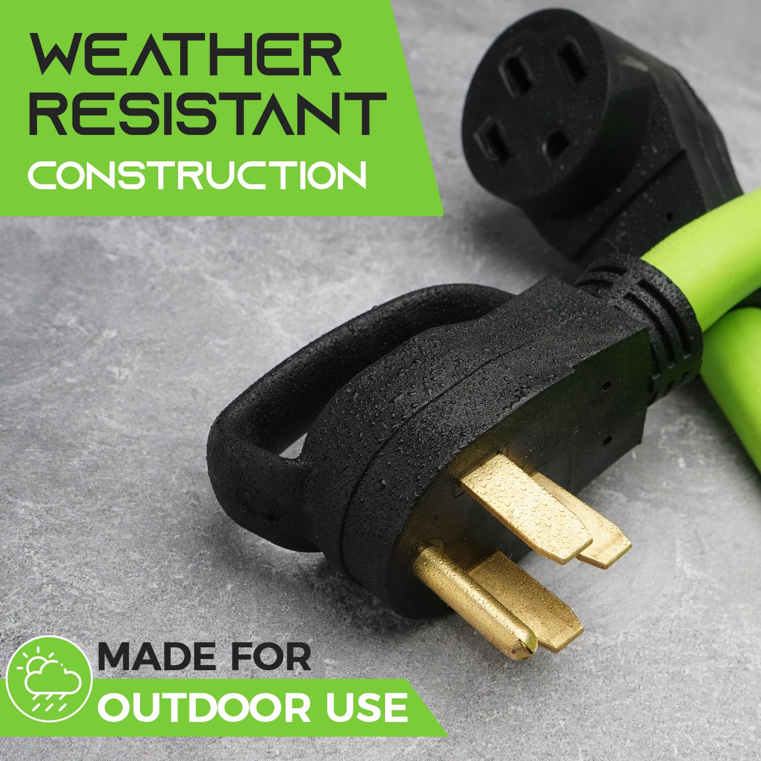 • 50 Amp Extension Cord for RV/EV - This 50 amp charging extension cord reaches up 15 feet from the power outlet to charge your recreational and electric vehicle. With NEMA 14-50 connectors, weather resistant outer jacket and bright green color for easy spotting in the dark, this extension cord is the safe and effective choice for charging your vehicle.