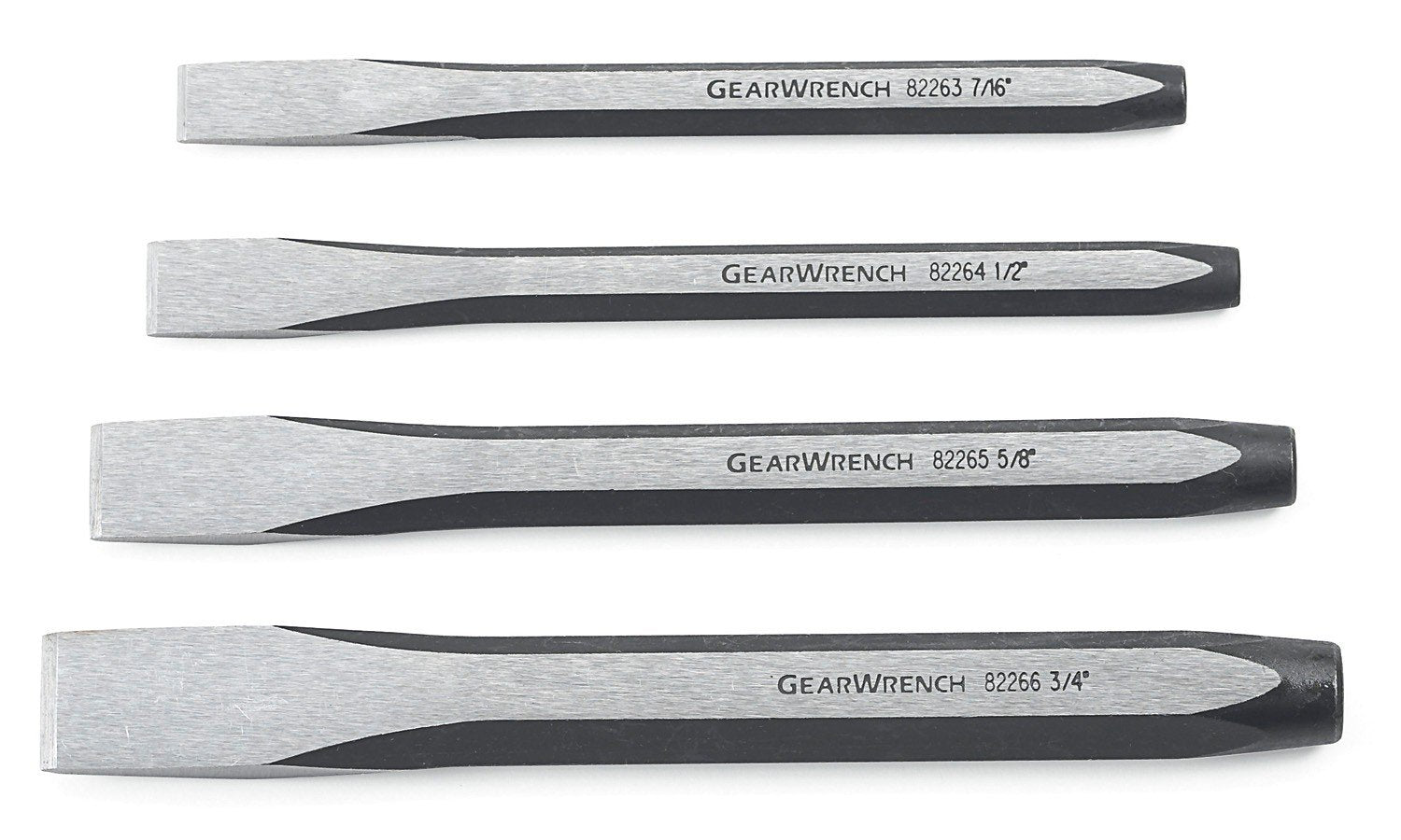 Details: This 4-piece collection of cold chisels from GEARWRENCH includes four common sizes. Use these chisels to cut through metal, especially rivets, bolts, or nuts that you encounter in your professional work. For truly stuck or damaged fasteners, a chisel can provide the only solution; this set includes 7/16", 1/2", 5/8", and 3/4" sizes. The work ends of these chisels have a precision-hardened point, while the back ends have a softened and tapered design to reduce their chipping potential.