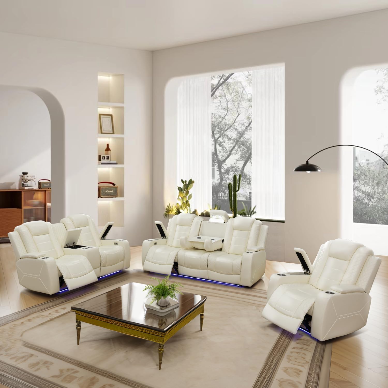 GEBADOL Power Recliner Sofa Set, Breathing Leather Sofa Set with Storage Console/Cup Holders/USB Ports, Leather Reclining Couch Set for Living Room (Creamy White, Sofa+LOVESEAT+Chair)