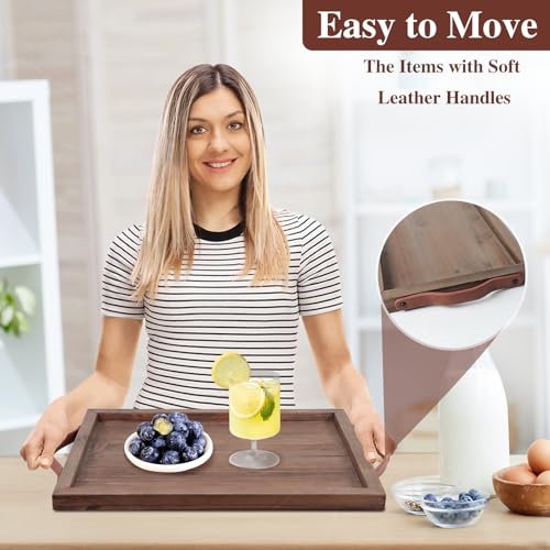 - 【Multifunctional Wooden Serving Trays】 Our 2 sets of rustic large wooden serving trays are made of environmentally friendly wood material that is sturdy and lightweight for a long time to use. It can be used as your coffee table tray for coffee bar, ottoman tray, breakfast tray, a tray for kitchen counter, bathroom trays, candle tray, cheese tray platter, a lap tray for eating, a veggie tray platter, and more.