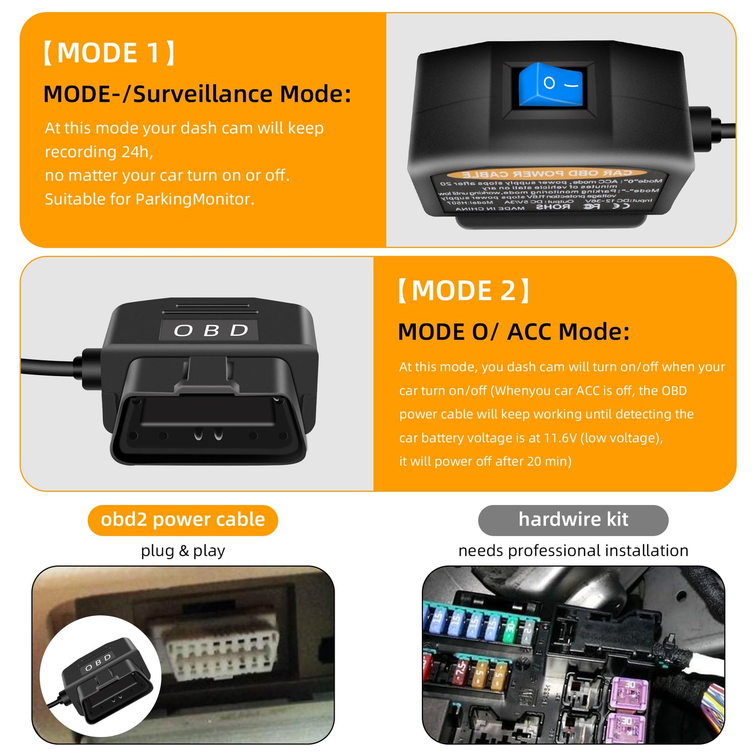 - 【2 Work Modes】For added convenience, a dual-mode switch button is included. In "-" mode, the OBD power cable offers 24-hour parking surveillance, continuing to operate even after the vehicle has stopped. It automatically shuts off after eight seconds when the vehicle's voltage drops below 11.6V. In "O" mode, the Dash Cam Hardwire Kit OBD operates in ACC mode, powering off automatically after 20 minutes when the vehicle is stopped.