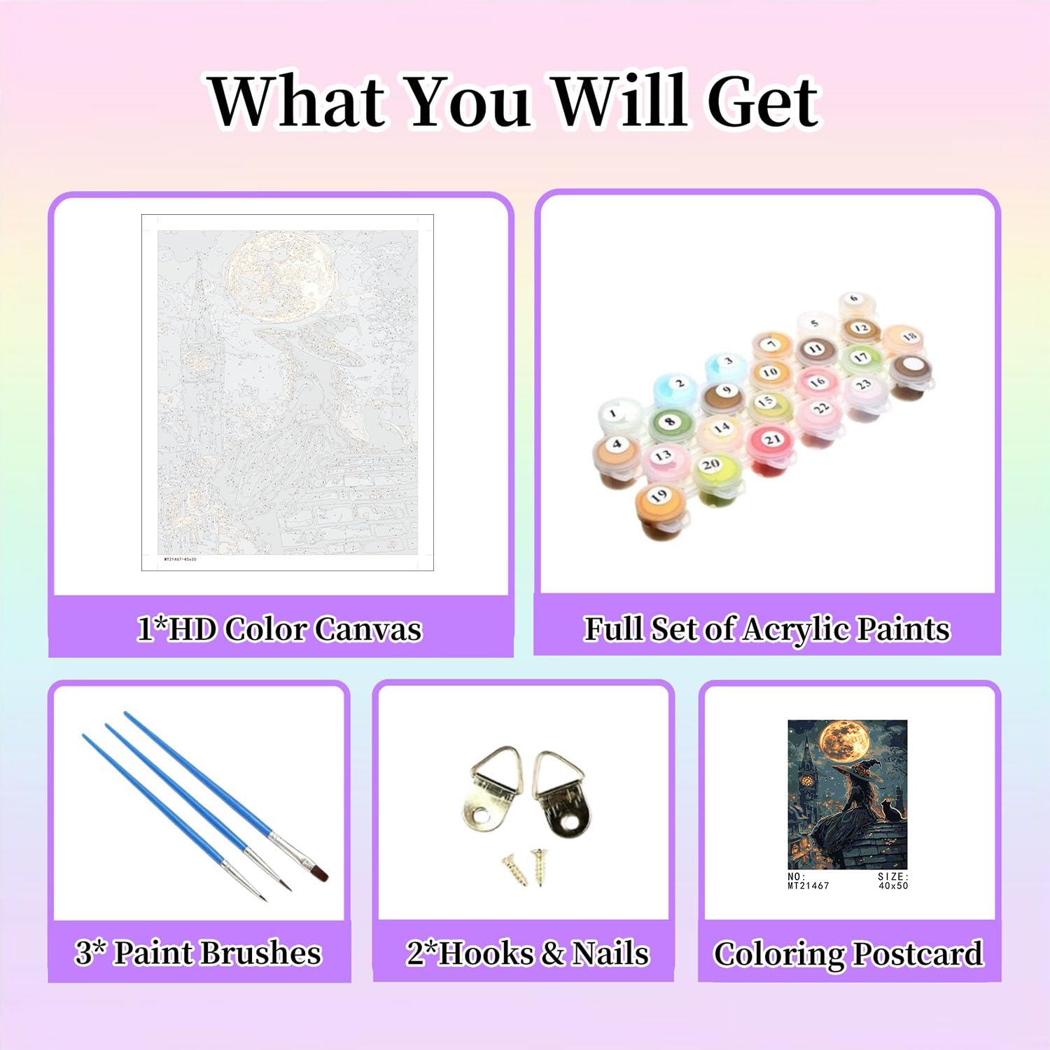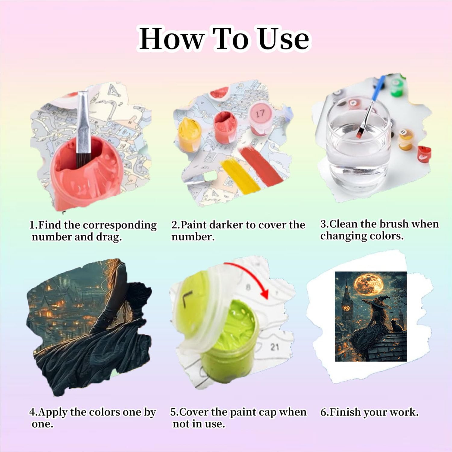 - Halloween Paint by Numbers Kit for Adults: Halloween paint by numbers kits included 16x20 inch (40x50cm) numbered canvas, 3x high quality brushes, 1 set of acrylic paint, 1 x numbered reference canvas and 2 x metal hooks. All the tools are included so you can start painting right away.
