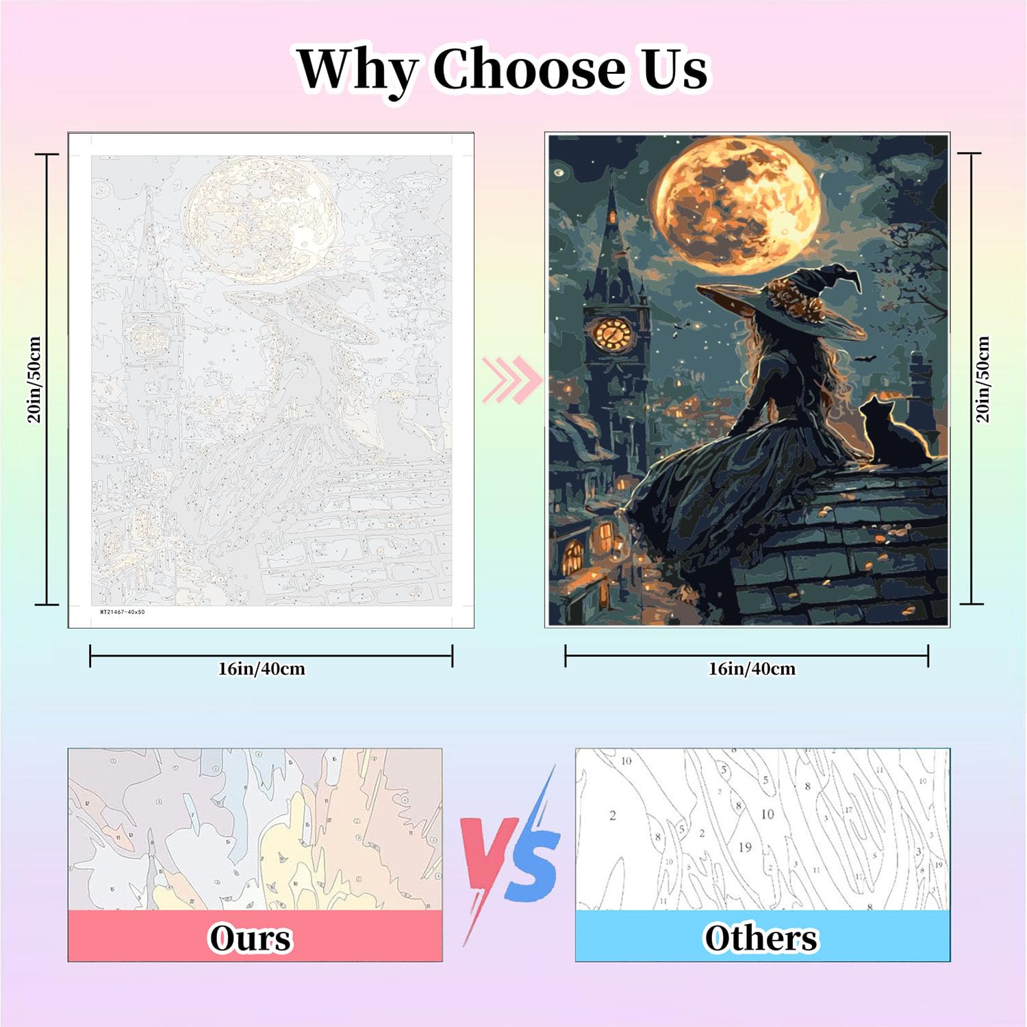 - High Quality Paint by Numbers for Adults canvas: Halloween Paint by number kit for adults canvas is moisture-proof and waterproof, it is thick and difficult to penetrate and paint is easier to adhere to it; The numbers on the canvas are clear and easy to read, which can help you paint better. The pigments are bright-colors,and it's not easy to fade and dry