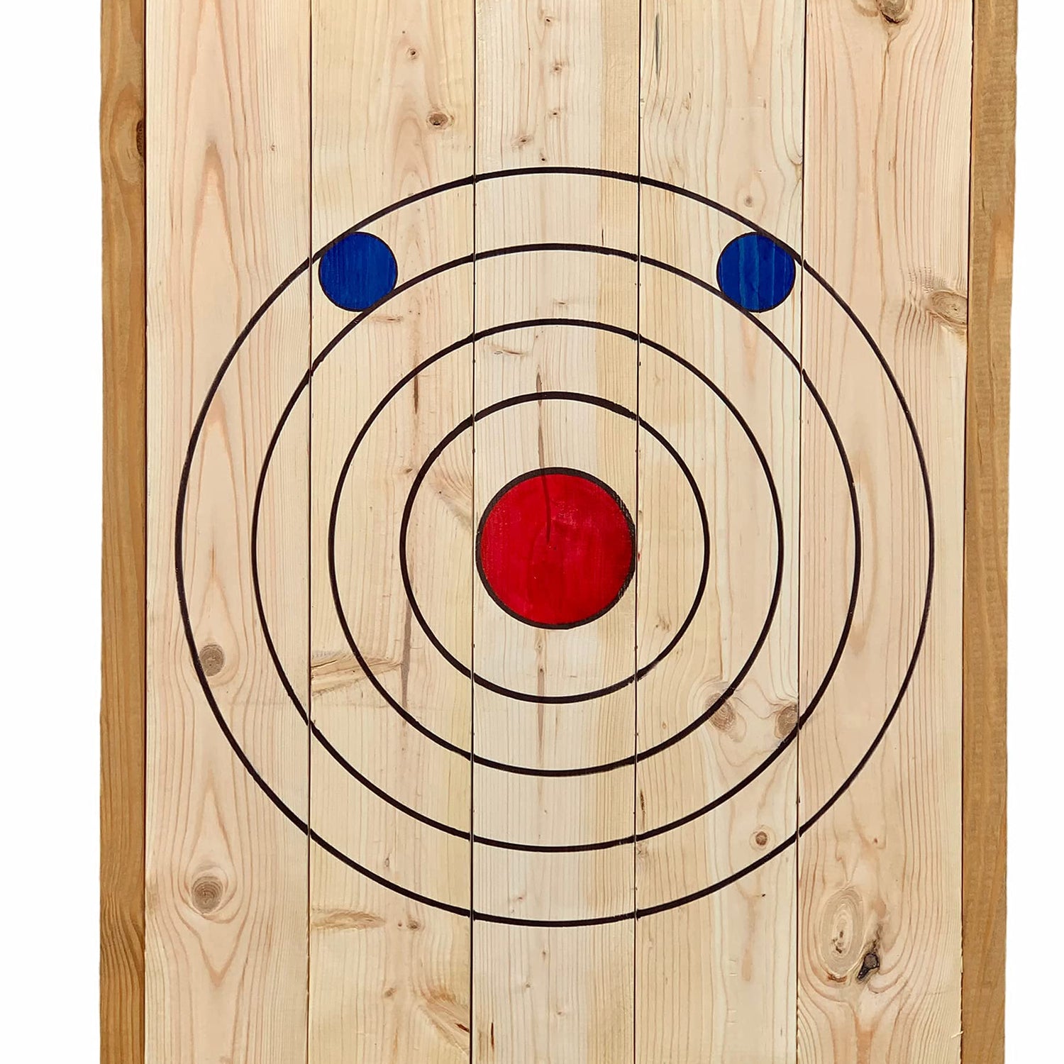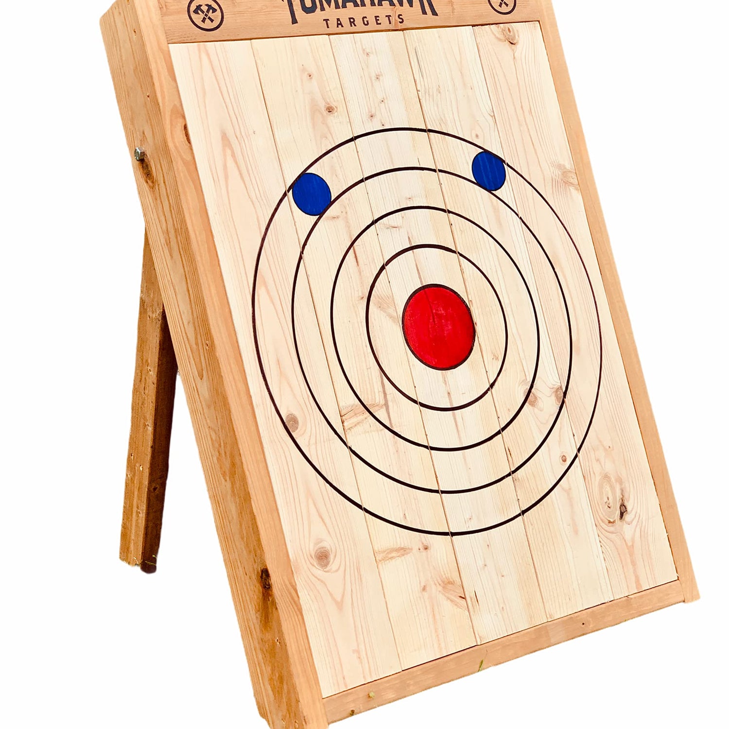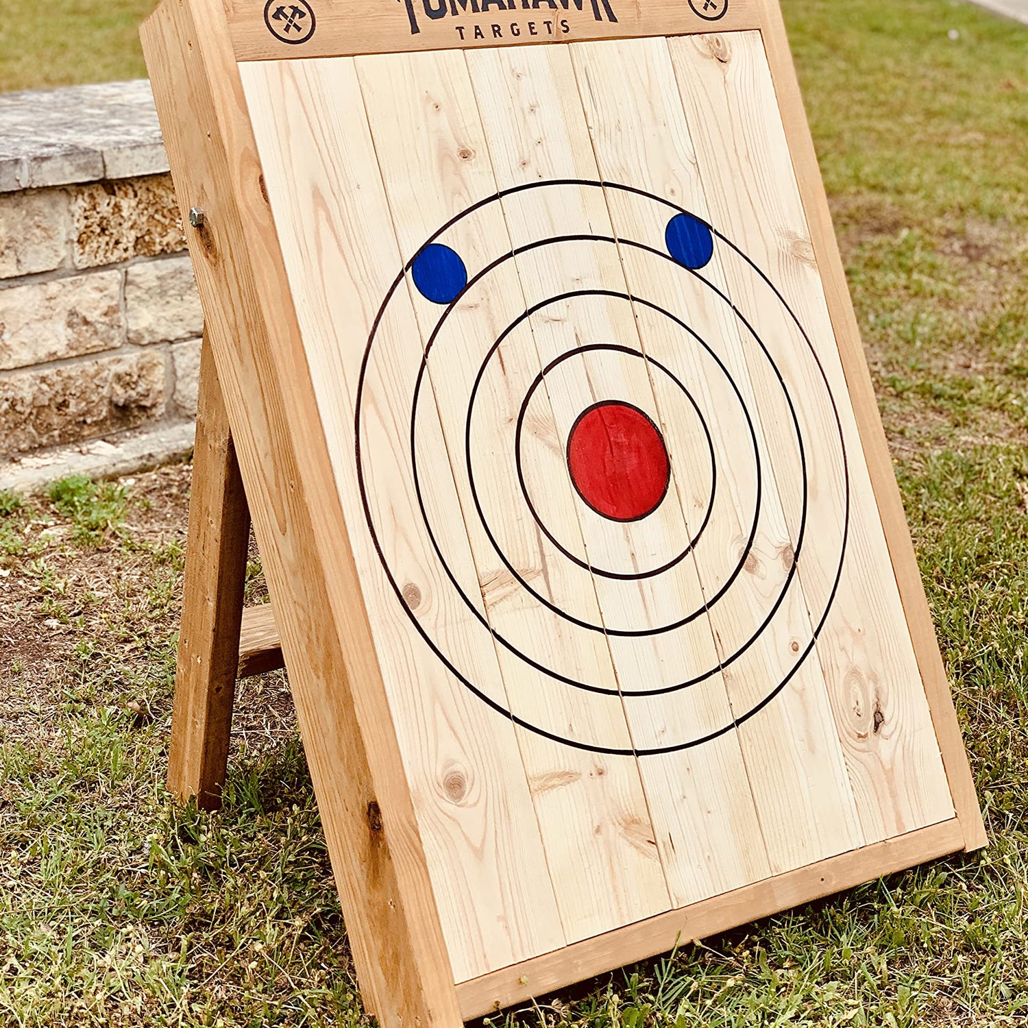 Details: Dimensions: 40"x 6" x 30" 50lbs *PATENT PENDING DESIGN* Product Description: Leaning Axe Throwing Target with kickstand foldable legs. Stained frame. . "Tomahawk Targets" logo headboard. Hand painted 4-Ring target with "kill shot" clutches Foldable and easy to Store Handles and weapon holders included. AXES NOT INCLUDED Easy drill in and out boards to replace from the rear of target. Good for knife throwing as well. message us for any questions or concerns.