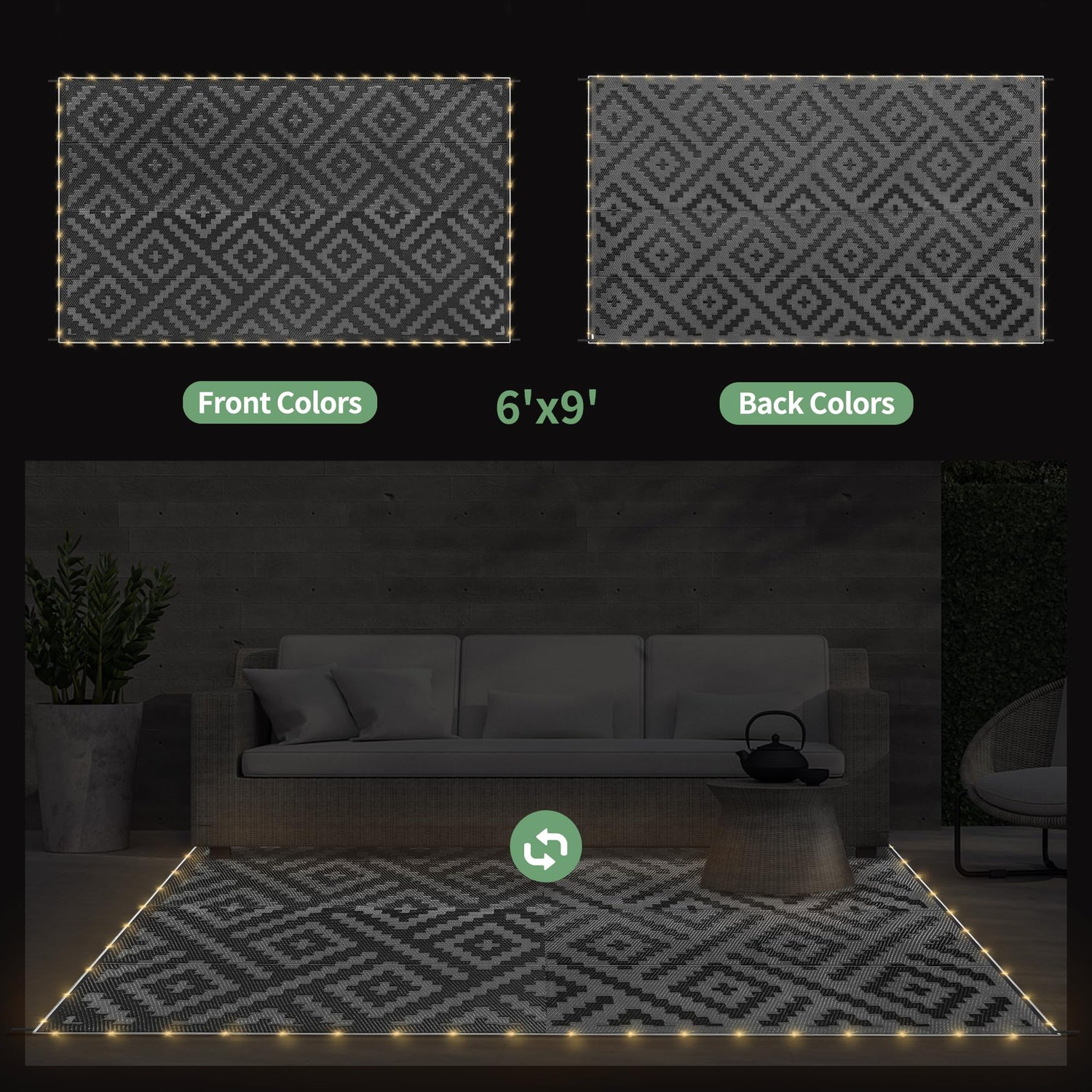 GENIMO Outdoor Rug with LED Strip Lights, 6'x9' Waterproof Camping Mat, Reversible Plastic Straw Rugs for Patio, RV, Camper, Balcony, Backyard, Picnic, Deck, Black & Gray