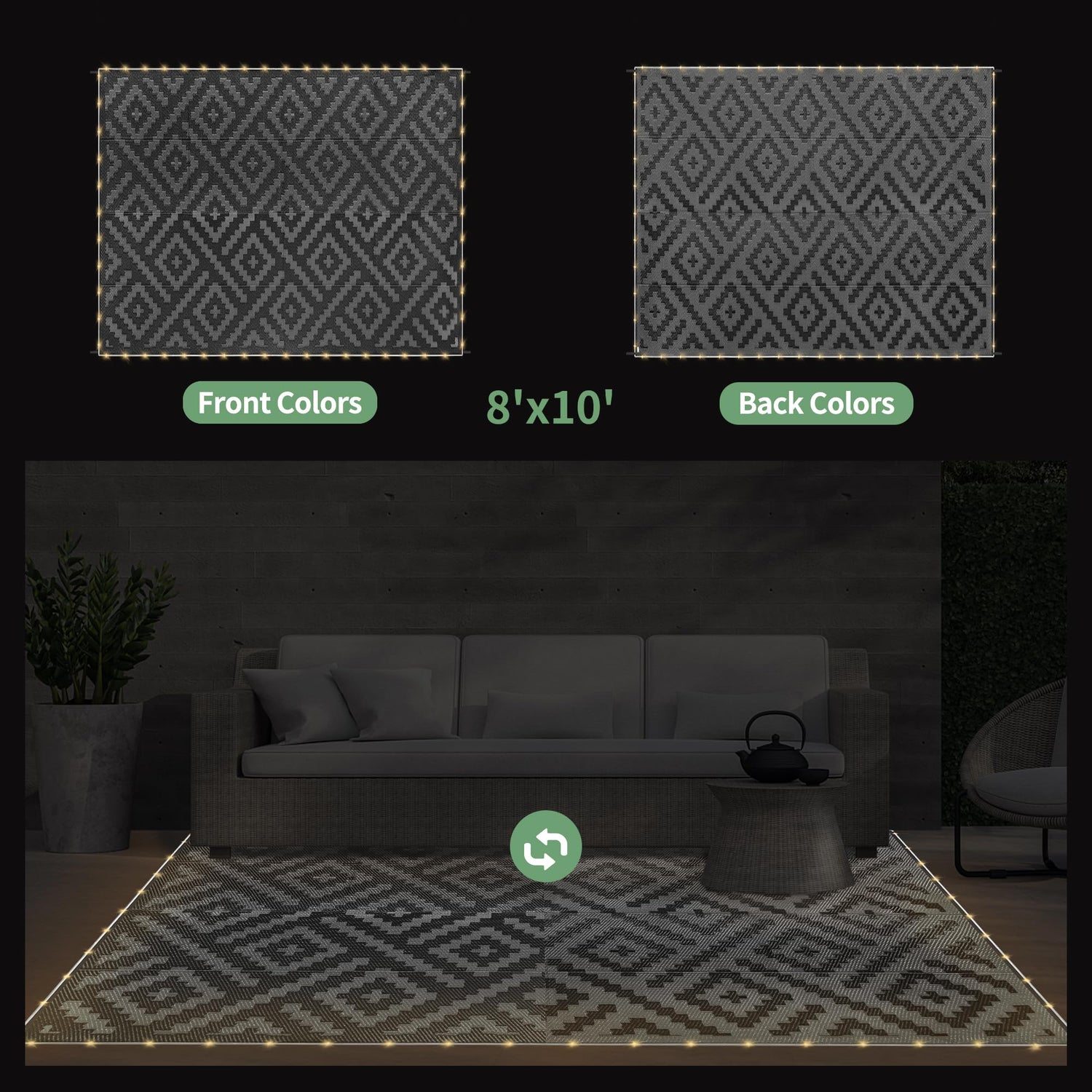 GENIMO Outdoor Rug with LED Strip Lights, 8'x10' Waterproof Camping Mat, Reversible Plastic Straw Rugs for Patio, RV, Camper, Balcony, Backyard, Picnic, Deck, Black & Gray