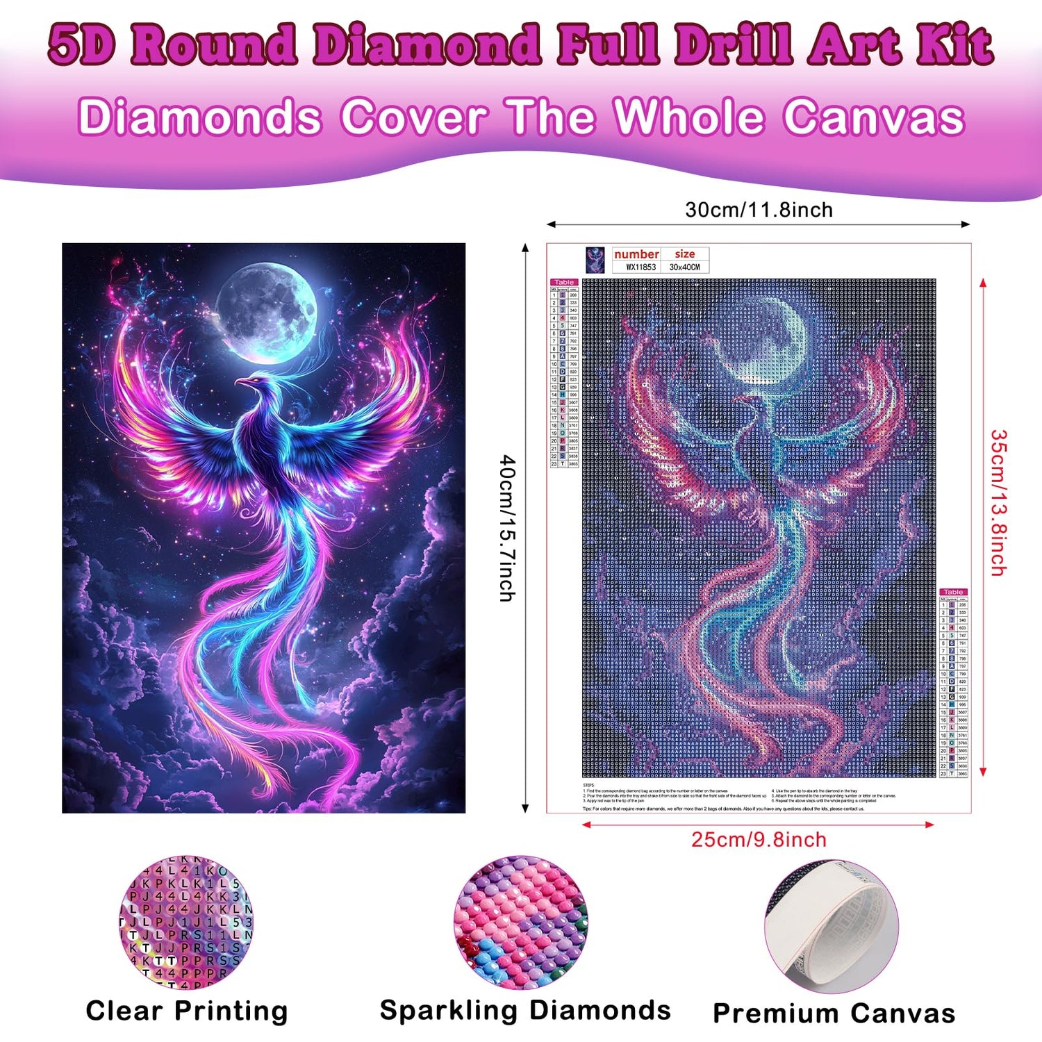 - 5D Diamond Painting Kits for Adults: Each phoenix diamond painting comes with all tools in need. Following tools are Included: 1*HD painting canvas, 2*diamond pen, 1*diamond tray, 1*red glue clay, 1*replaceable correction pen, 5*plastic bags for putting diamonds, and enough colorful round diamonds. For each kit we'll provide 20% diamond more than need