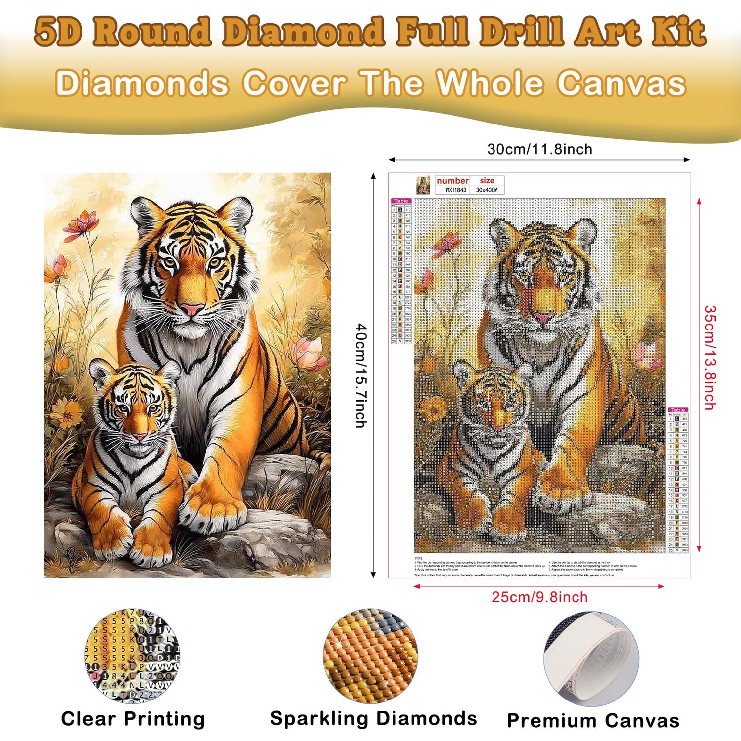 - 5D Diamond Painting Kits for Adults: Each tiger diamond painting comes with all tools in need. Following tools are Included: 1*HD painting canvas, 2*diamond pen, 1*diamond tray, 1*red glue clay, 1*replaceable correction pen, 5*plastic bags for putting diamonds, and enough colorful round diamonds. For each kit we'll provide 20% diamond more than need