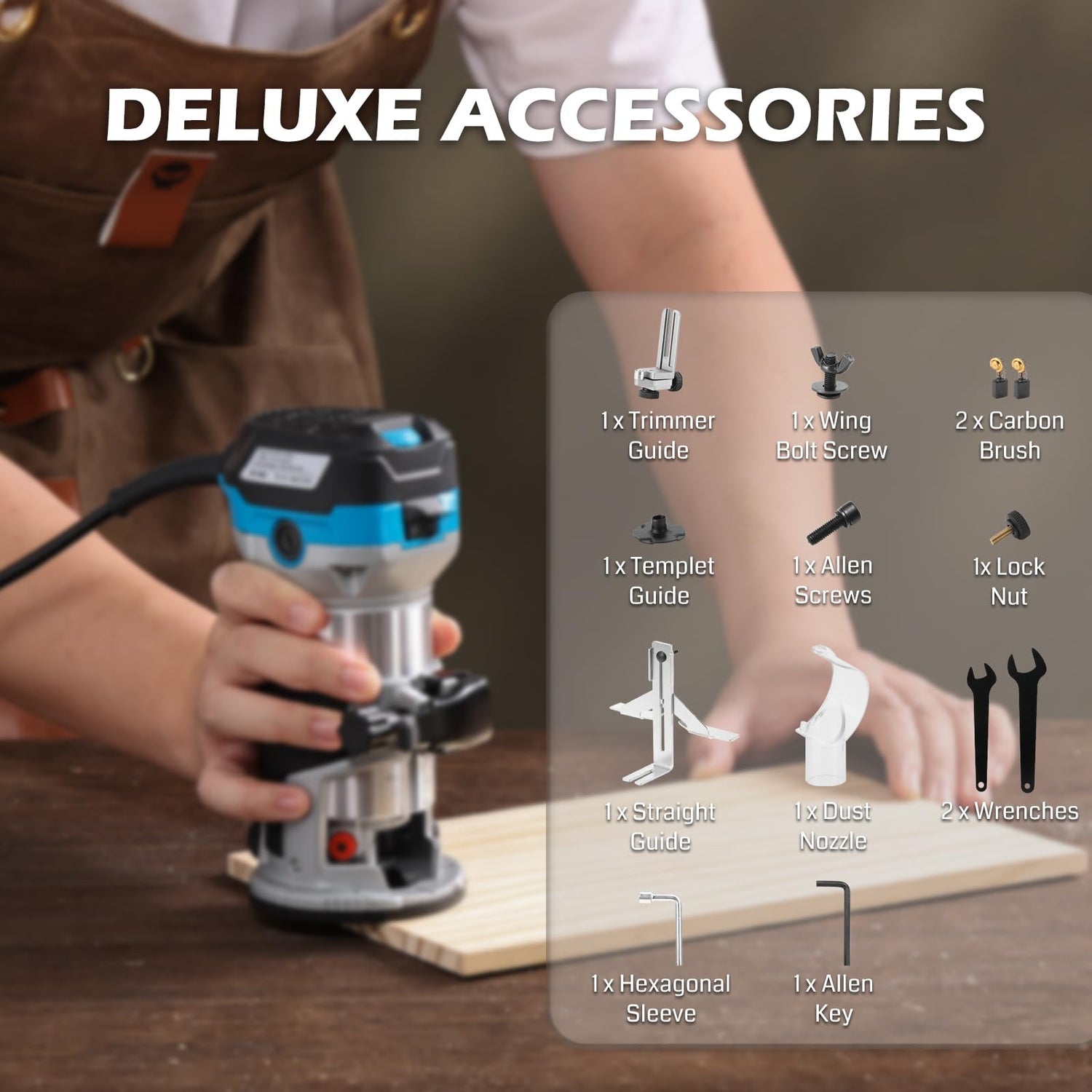 - Complete Package: This package includes all the necessary accessories, such as straight guides, trimming guides, or template guides, to ensure an accurate and consistent process that meets your required specifications.