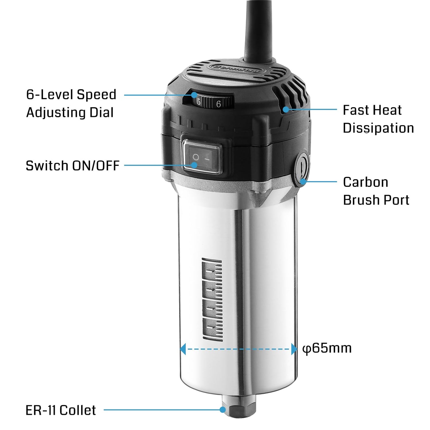 - Reliable Performance: This Compact Router packs a punch with its robust 710W power output. Featuring a rotation speed range of 6500-30000 RPM adjustable in 1-6 speeds and constant torque control with a soft start, it ensures smooth operation even under heavy loads.